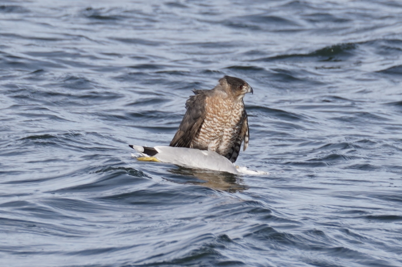 [edit]Beyond aforementioned families and orders, other types of birds are taken relatively infrequently. Usually moderate to low numbers of water birds are taken of any variety. About 5 species each of duck and heron, a dozen species of shorebird and a smaller assortment of grebes and rails are known in the prey spectrum.[7][46][188] Even among water birds, nonetheless, a wide diversity may be taken, from the tiny 22.9 g (0.81 oz) least sandpiper (Calidris minutilla) to an adult mallard (Anas platyrhynchos) estimated to weigh 1,150 g (2.54 lb) when taken.[179][188][217][245][246] Adult ducks and herons of roughly equal weight to Cooper's hawks and other largish adult water birds including ring-billed gulls (Larus delewarensis) and American coots (Fulica americana) are sometimes tackled by these hawks.[7][49][46][207][247] Particularly frequency was recorded of 312.7 g (11.03 oz) western cattle egrets (Ardea ibis) in north Florida, where the egrets were the fourth most regularly recorded prey species.[49] Assorted families of land birds are fairly rare as reported in food studies, including some nightjars, trogons, swifts, kingfishers, parrots and assorted other raptorial birds.[59][49][179][180][186][248][249][250][251]