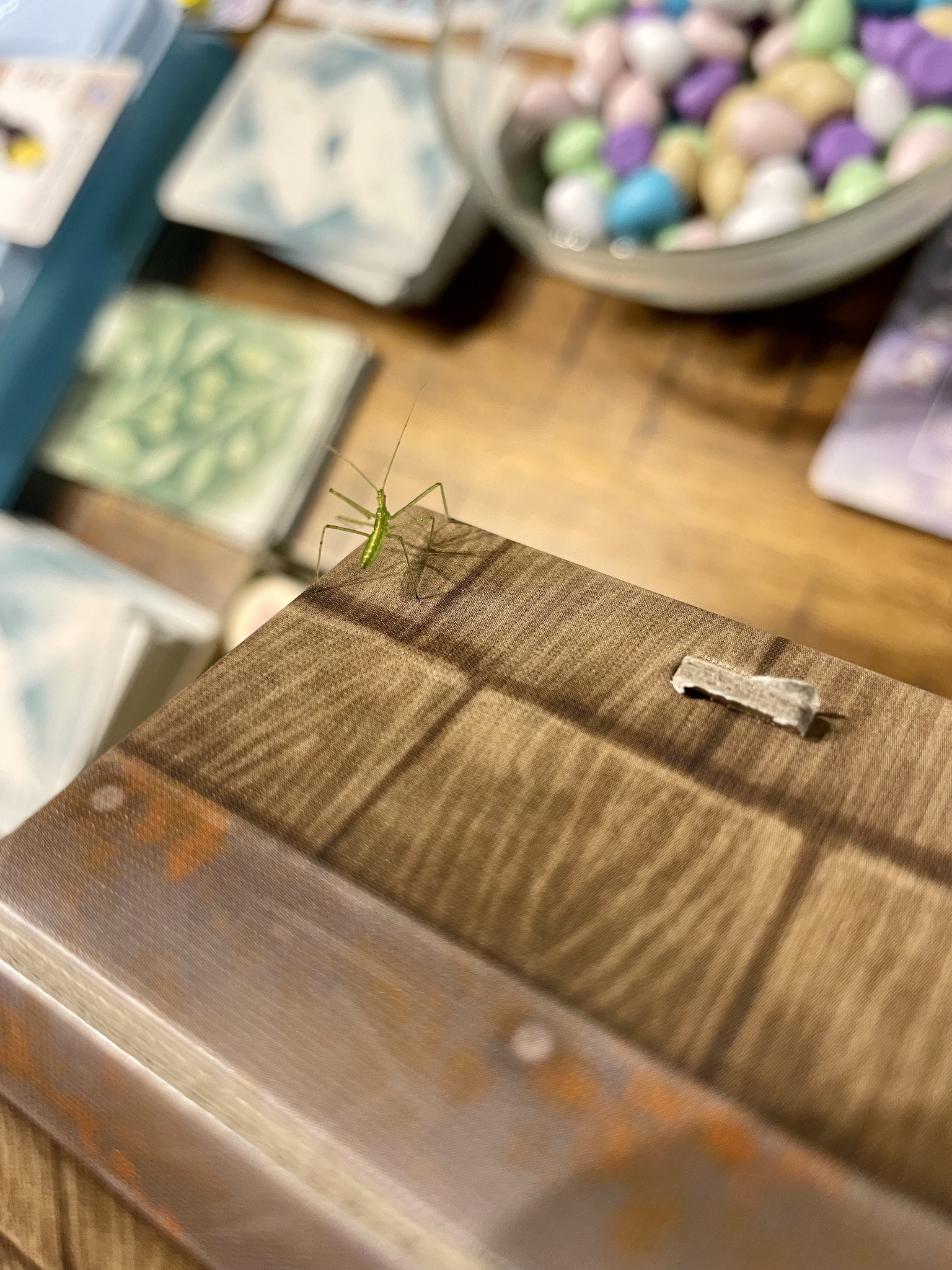 [edit]The size ranges from 12.5 to 18 millimetres (0.49 to 0.71 in) long.[2] On average, adult females are 16 millimetres (0.63 in) long, while males are 14 millimetres (0.55 in) long. Though the base color is pale green, markings on the back can range from dark brown or red to bright yellow. Nymphs are generally more solid green, wingless, and with narrower bodies than adults.[3] The most reliable feature to distinguish this species from others is the pair of spines on the rear corners of the pronotum. These spines are long on the lighter colored individuals and shorter on ones that are darker. It can also be distinguished by dark bands on the distal ends of the femurs, but these can often be too light to be easily seen.[1] The egg masses, which are laid from late June to August, are conical in shape with a flat top. They are laid on leaves in groups of twenty to fifty and held together with a sticky, brownish material. Their bite is extremely painful.[3]
