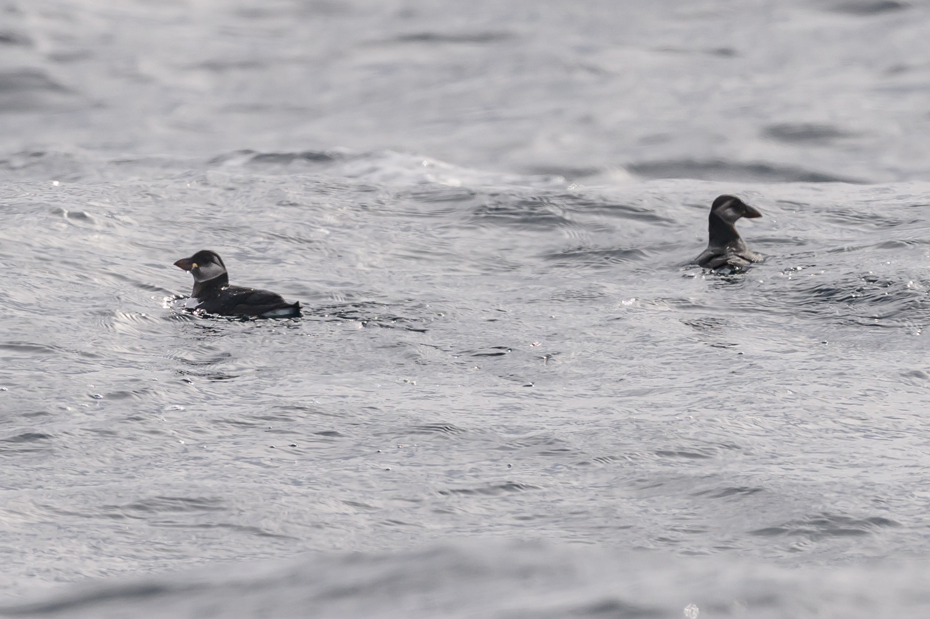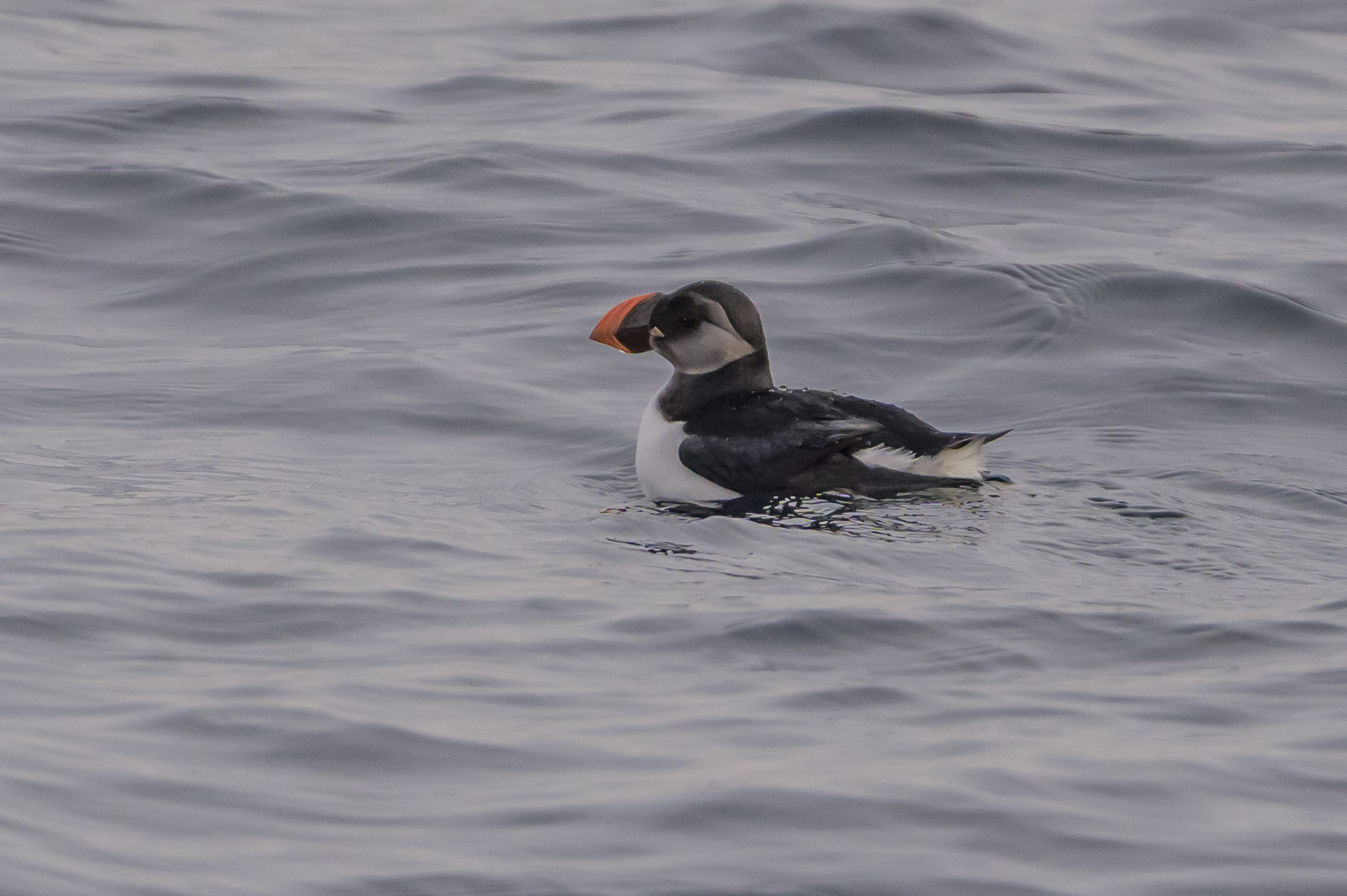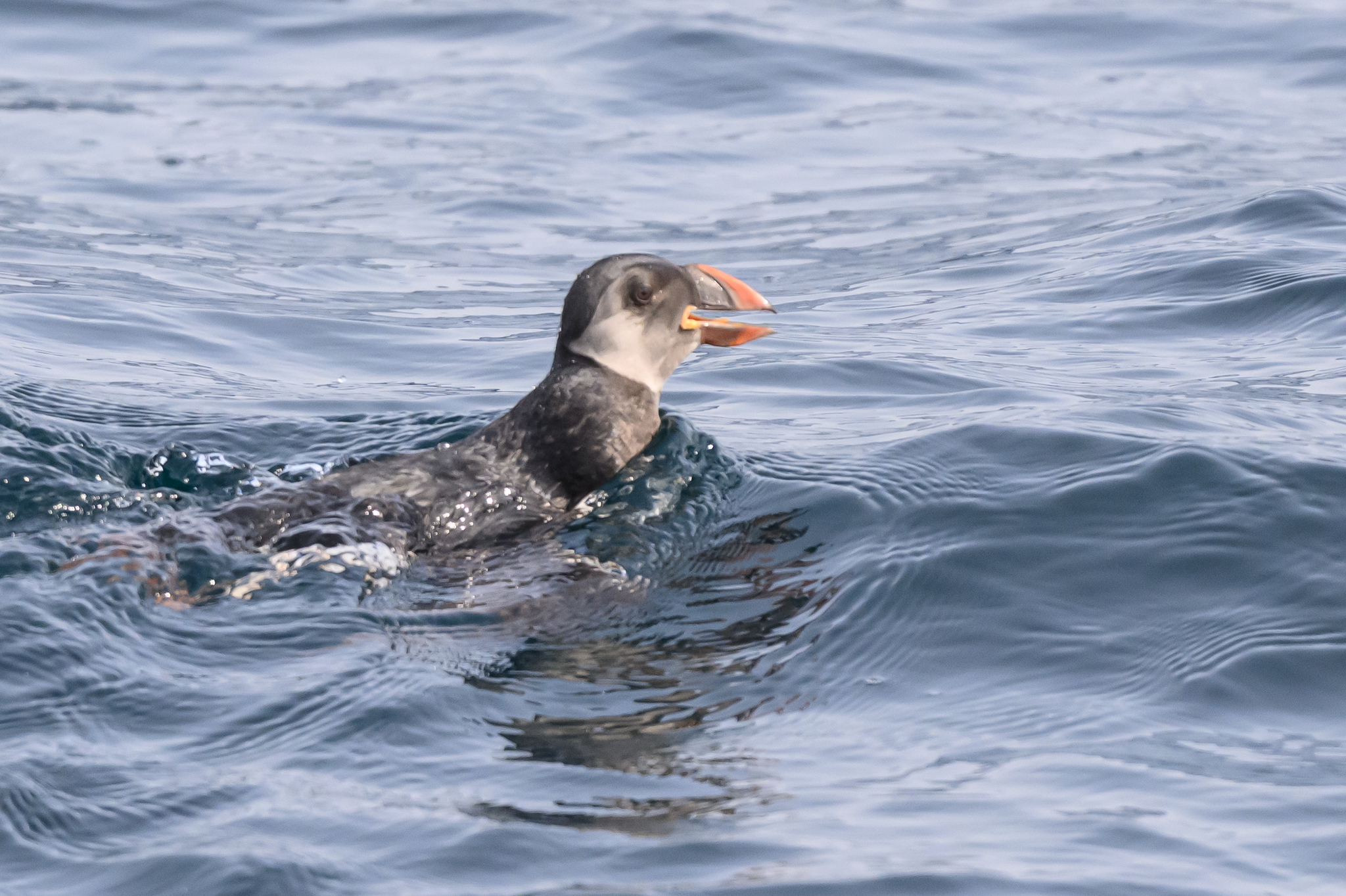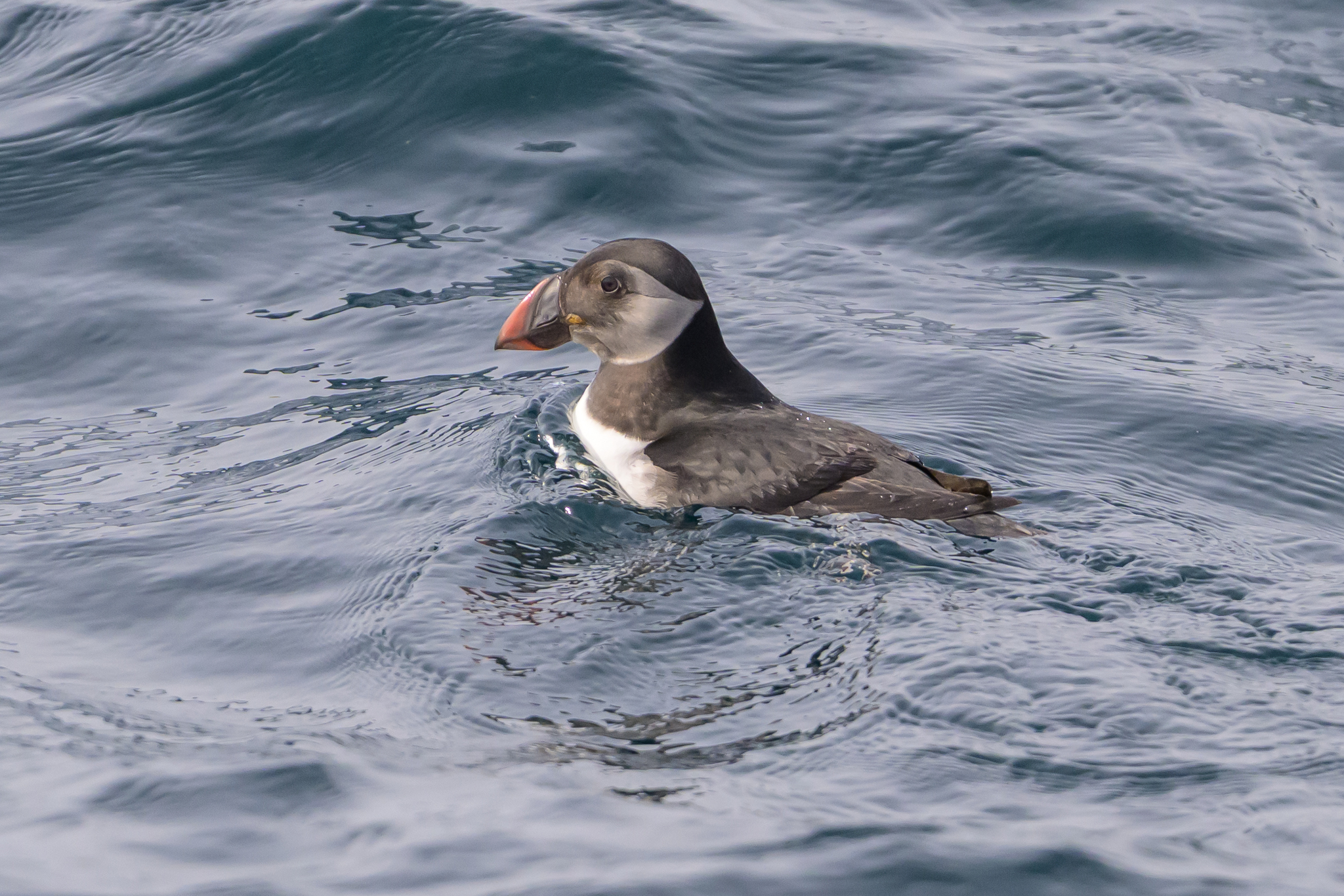 Atlantic puffins lead solitary existences when out at sea, and this part of their lives has been little studied, as the task of finding even one bird on the vast ocean is formidable. When at sea, they bob about like a cork, propelling themselves through the water with powerful thrusts of their feet and keeping turned into the wind, even when resting and apparently asleep. They spend much time each day preening to keep their plumage in order and spread oil from their preen glands. Their downy under plumage remains dry and provides thermal insulation. In common with other seabirds, their upper surface is black and underside white. This provides camouflage, with aerial predators unable to locate the birds against the dark, watery background, and underwater attackers fail to notice them as they blend in with the bright sky above the waves.[16]: 30–43