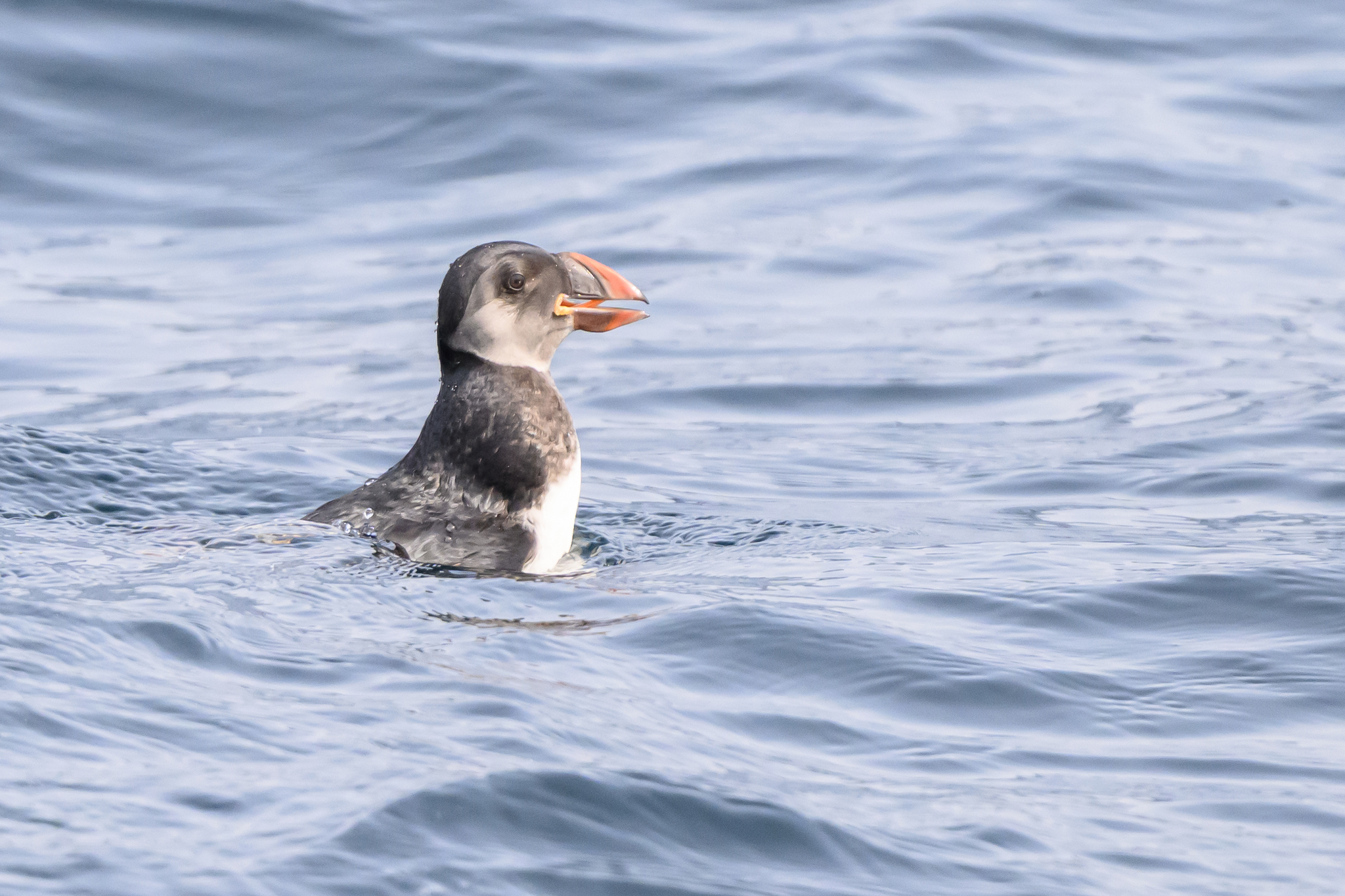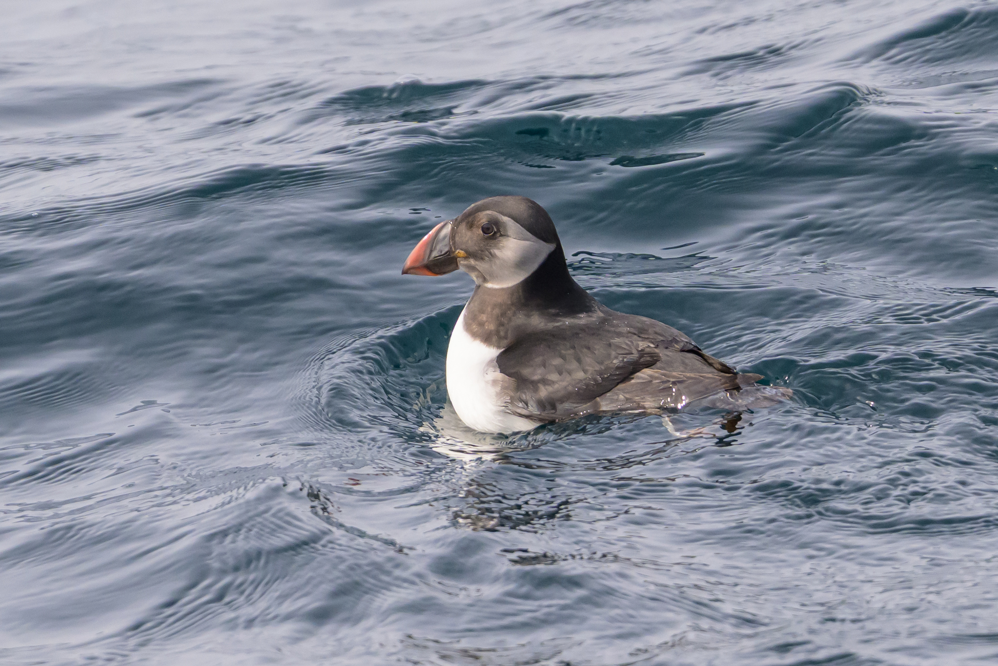 Spending the autumn and winter in the open ocean of the cold northern seas, the Atlantic puffin returns to coastal areas at the start of the breeding season in late spring. It nests in clifftop colonies, digging a burrow in which a single white egg is laid. Chicks mostly feed on whole fish and grow rapidly. After about 6 weeks, they are fully fledged and make their way at night to the sea. They swim away from the shore and do not return to land for several years.
