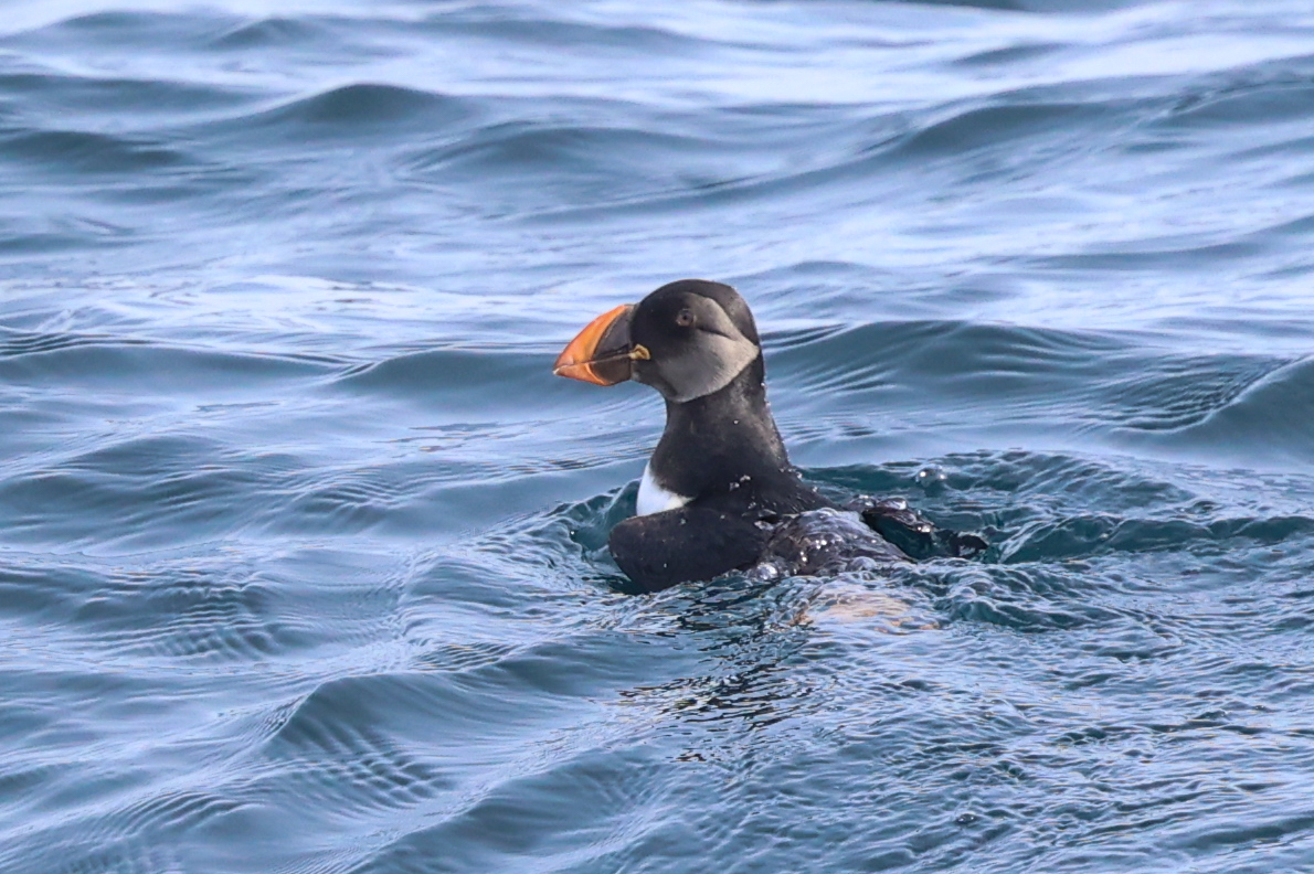 This puffin has a black crown and back, light grey cheek patches, and a white body and underparts. Its broad, boldly marked red-and-black beak and orange legs contrast with its plumage. It moults while at sea in the winter, and some of the brightly coloured facial characteristics are lost, with colour returning during the spring. The external appearances of the adult male and female are identical, though the male is usually slightly larger. The juvenile has similar plumage, but its cheek patches are dark grey. The juvenile does not have brightly coloured head ornamentation, its bill is narrower and is dark grey with a yellowish-brown tip, and its legs and feet are also dark. Puffins from northern populations are typically larger than those in the south, and these populations are generally considered to be a different subspecies.
