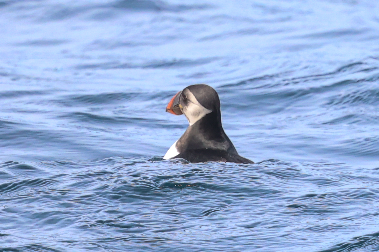 The Atlantic puffin (Fratercula arctica), also known as the common puffin, is a species of seabird in the auk family. It is the only puffin native to the Atlantic Ocean; two related species, the tufted puffin and the horned puffin, are found in the northeastern Pacific. The Atlantic puffin breeds in Russia, Iceland, Ireland,[2] Britain, Norway, Greenland, Newfoundland and Labrador, Nova Scotia, and the Faroe Islands, and as far south as Maine in the west and France in the east. It is most commonly found in the Westman Islands, Iceland. Although it has a large population and a wide range, the species has declined rapidly, at least in parts of its range, resulting in it being rated as vulnerable by the IUCN.[1] On land, it has the typical upright stance of an auk. At sea, it swims on the surface and feeds on zooplankton, small fish, and crabs, which it catches by diving underwater, using its wings for propulsion.