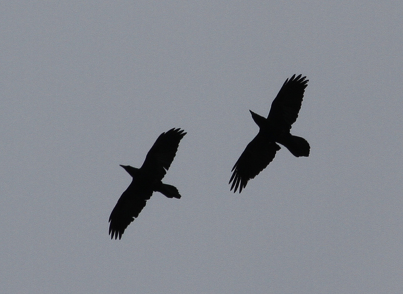 Common ravens usually travel in mated pairs, although young birds may form flocks. Relationships between common ravens are often quarrelsome, yet they demonstrate considerable devotion to their families.[65]