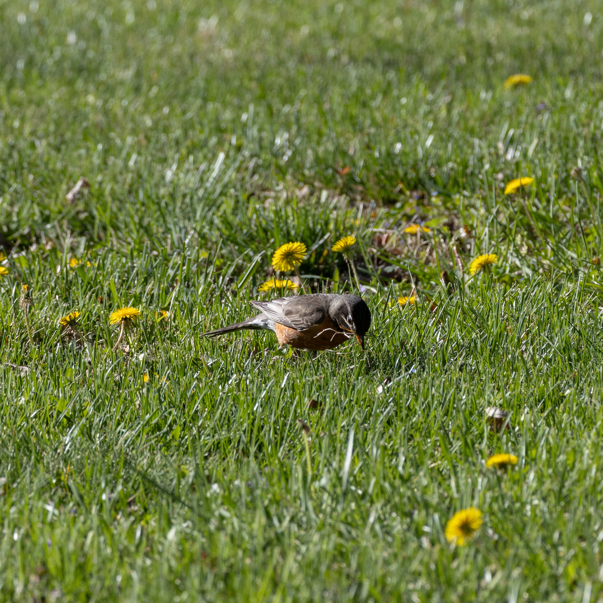 The species uses auditory, visual, olfactory and possibly vibrotactile cues to find prey, but vision is the predominant mode of prey detection.[28] It is frequently seen running across lawns picking up earthworms, and its running and stopping behavior is a distinguishing characteristic. In addition to hunting visually, it also has the ability to hunt by hearing. Experiments have shown that it can find earthworms underground by simply using its listening skills.[28]: 149 It typically will take several short hops and then cock its head left, right or forward to detect movement of its prey. In urban areas, robins will gather in numbers soon after lawns are mowed or where sprinklers are in use.[21]
