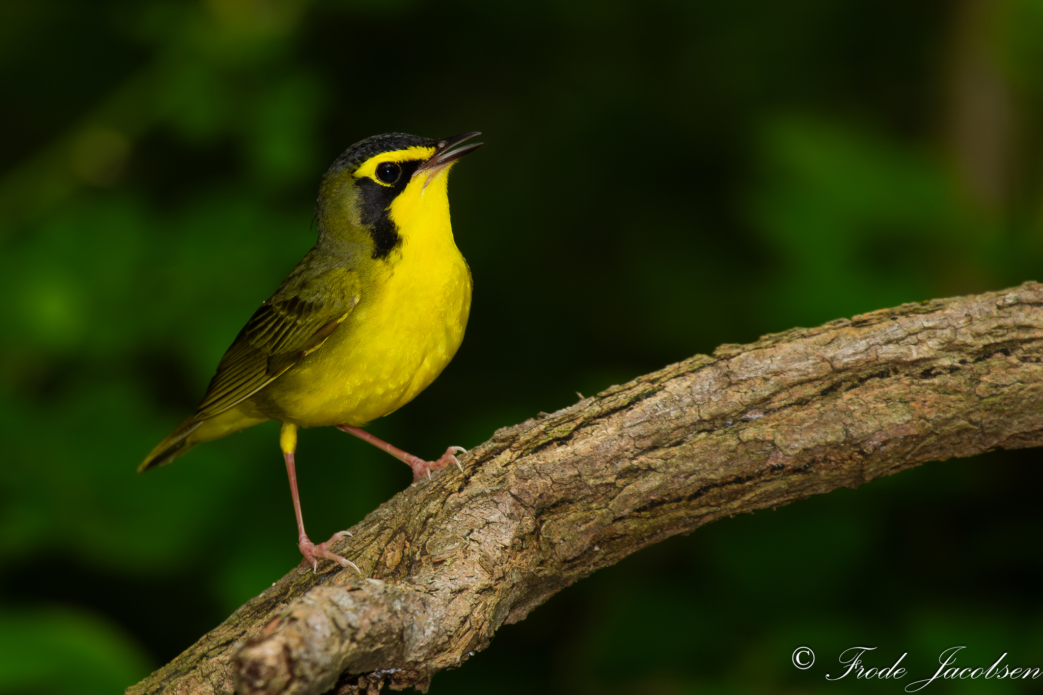 Adult Kentucky warblers are mostly an olive-green in color on their back and nape, and a brilliant yellow below from their throat to their belly. They have a small tinge of black on their crown, and a large black mask with a yellow pattern that runs from the beak and encircles the eyes, resembling a pair of spectacles. Female Kentucky warblers have slightly less black on the sides of their head, and immature birds may have almost no black at all.
