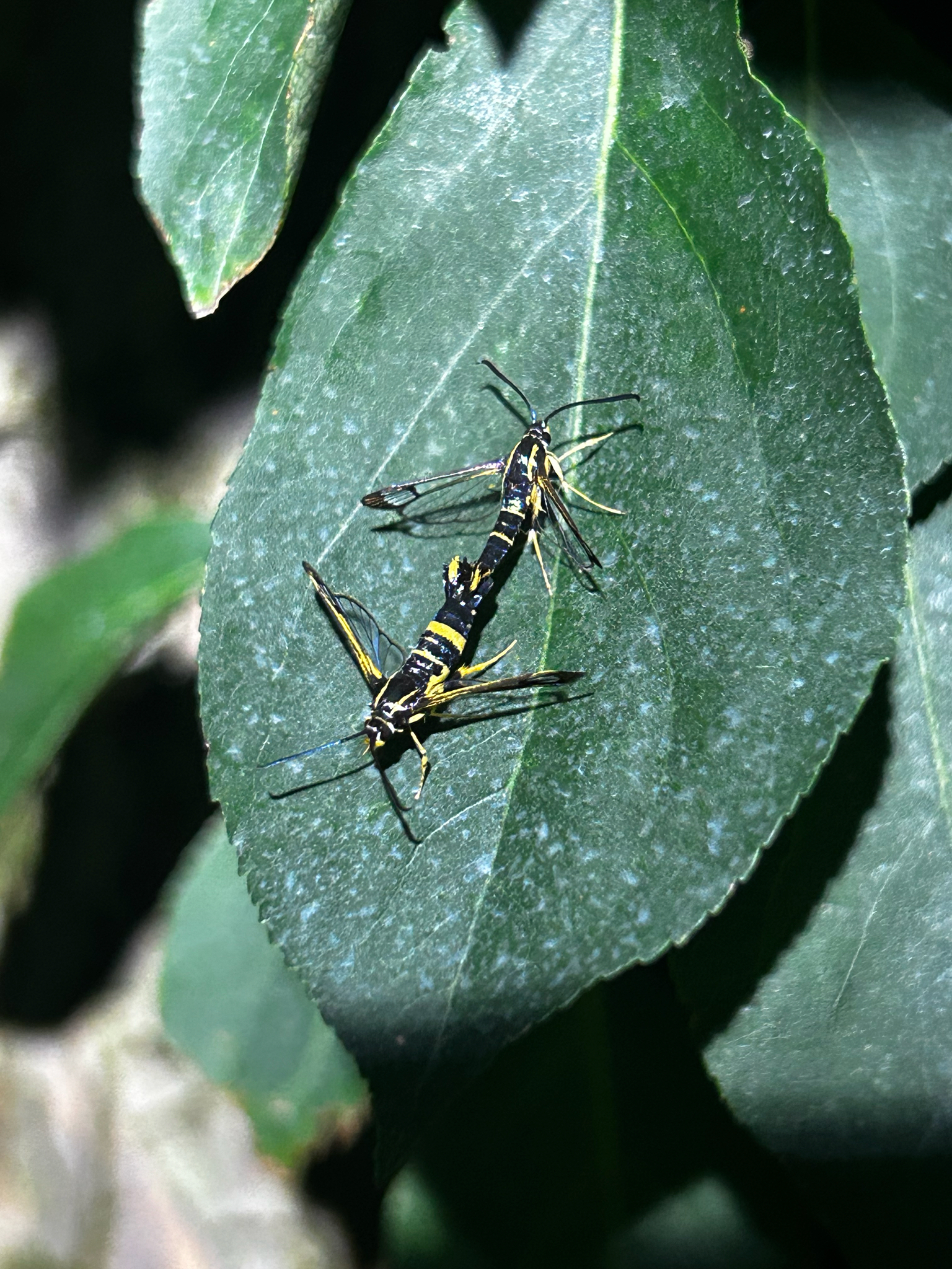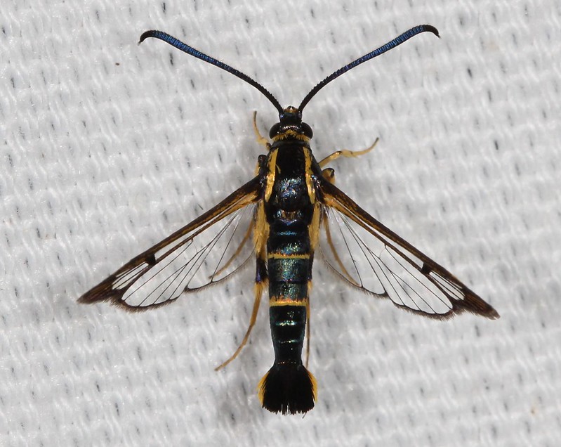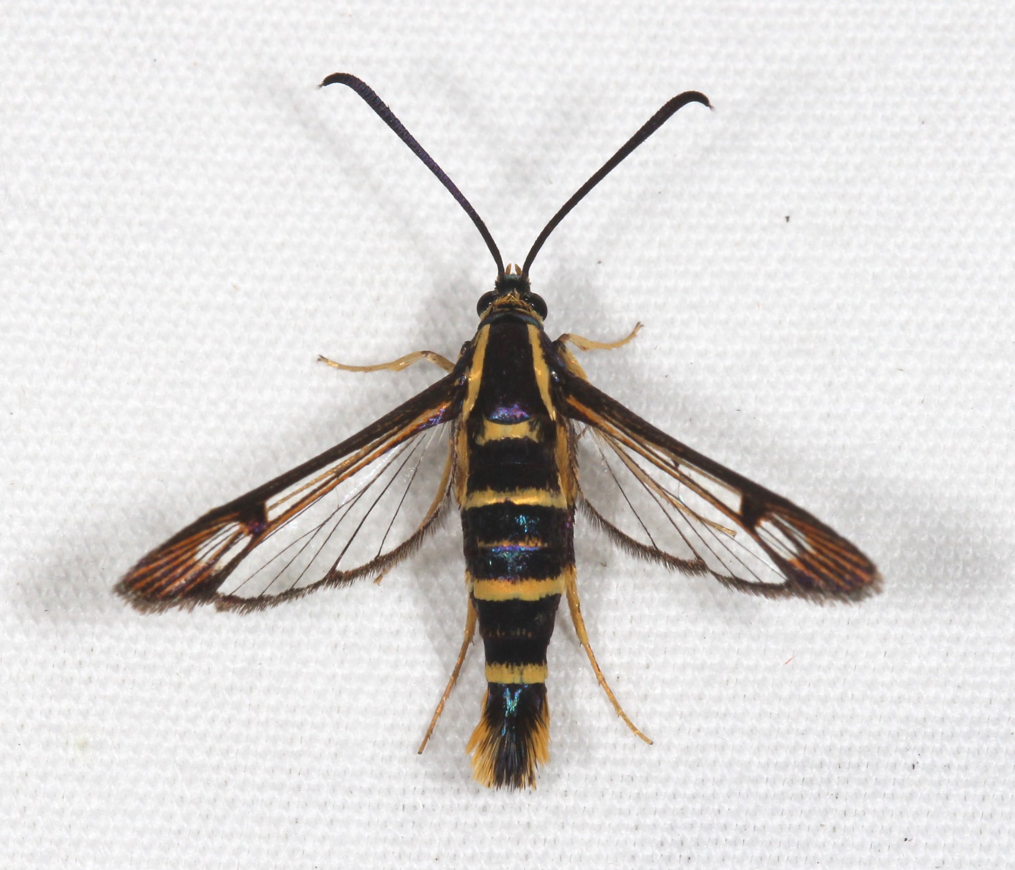 [edit]The average adult has a wing span of 18 to 22 millimeters. Both the fore and hind wings are mostly clear, and the thorax and the abdomen are navy blue or black with yellow markings. Female dogwood borers' fourth abdominal segment is entirely yellow, while the male's is black with a narrow yellow ring. In the Northeast, adult emergence begins in early June and continues into early September, peaking in mid July. The adults' emergence begins earlier further south.[2]