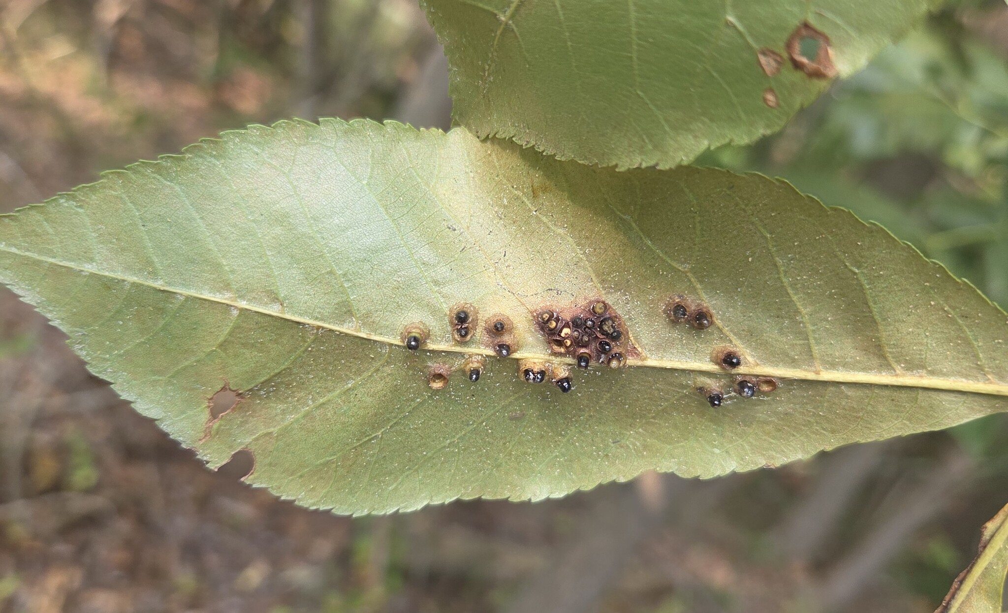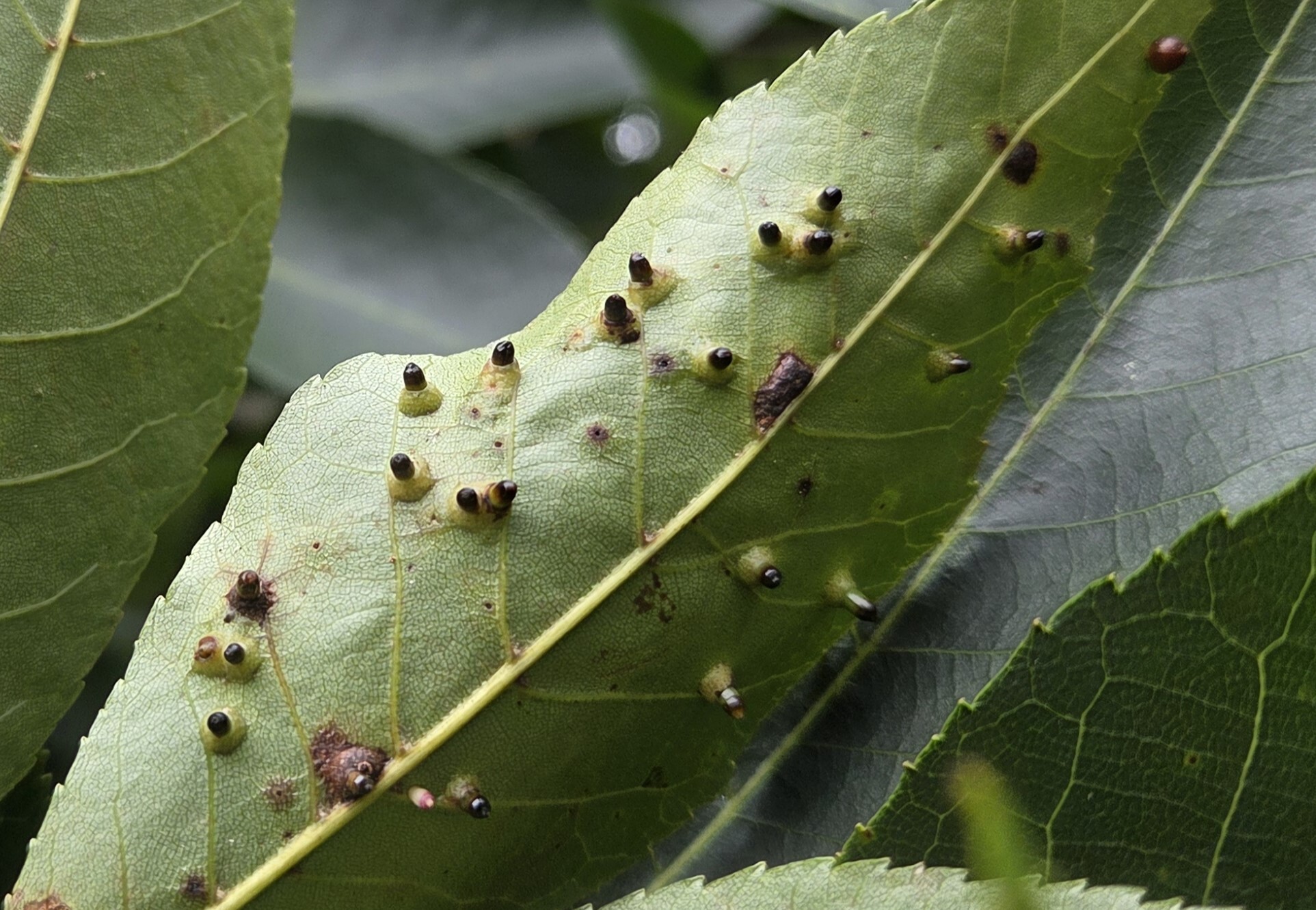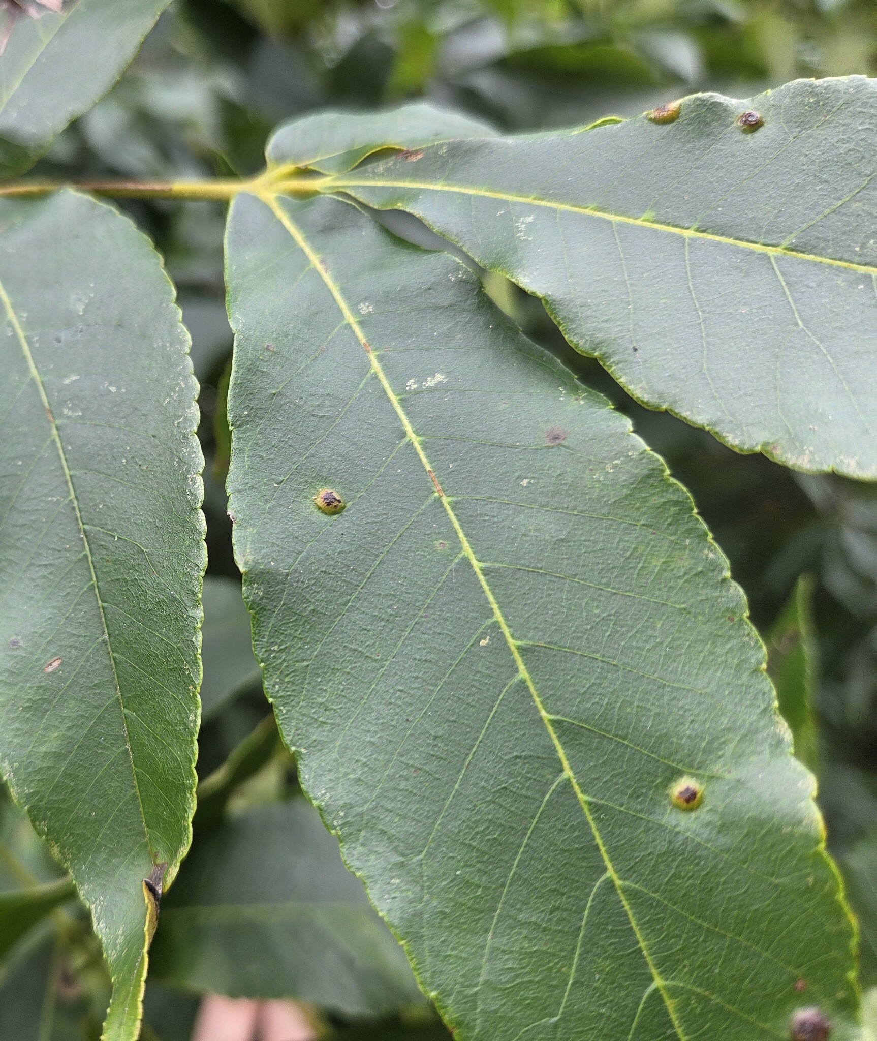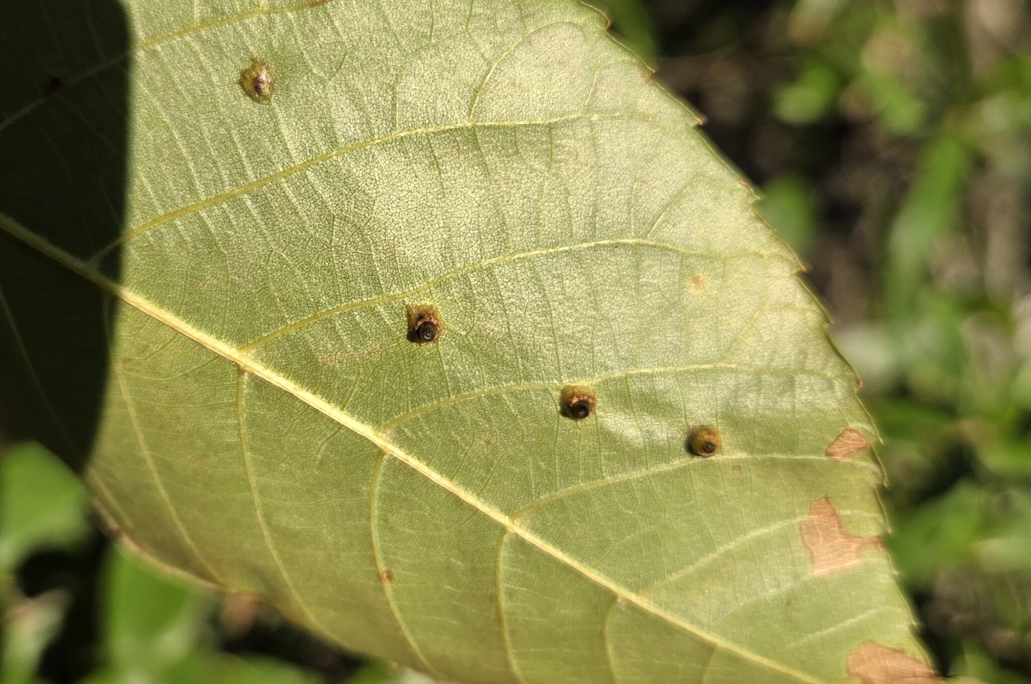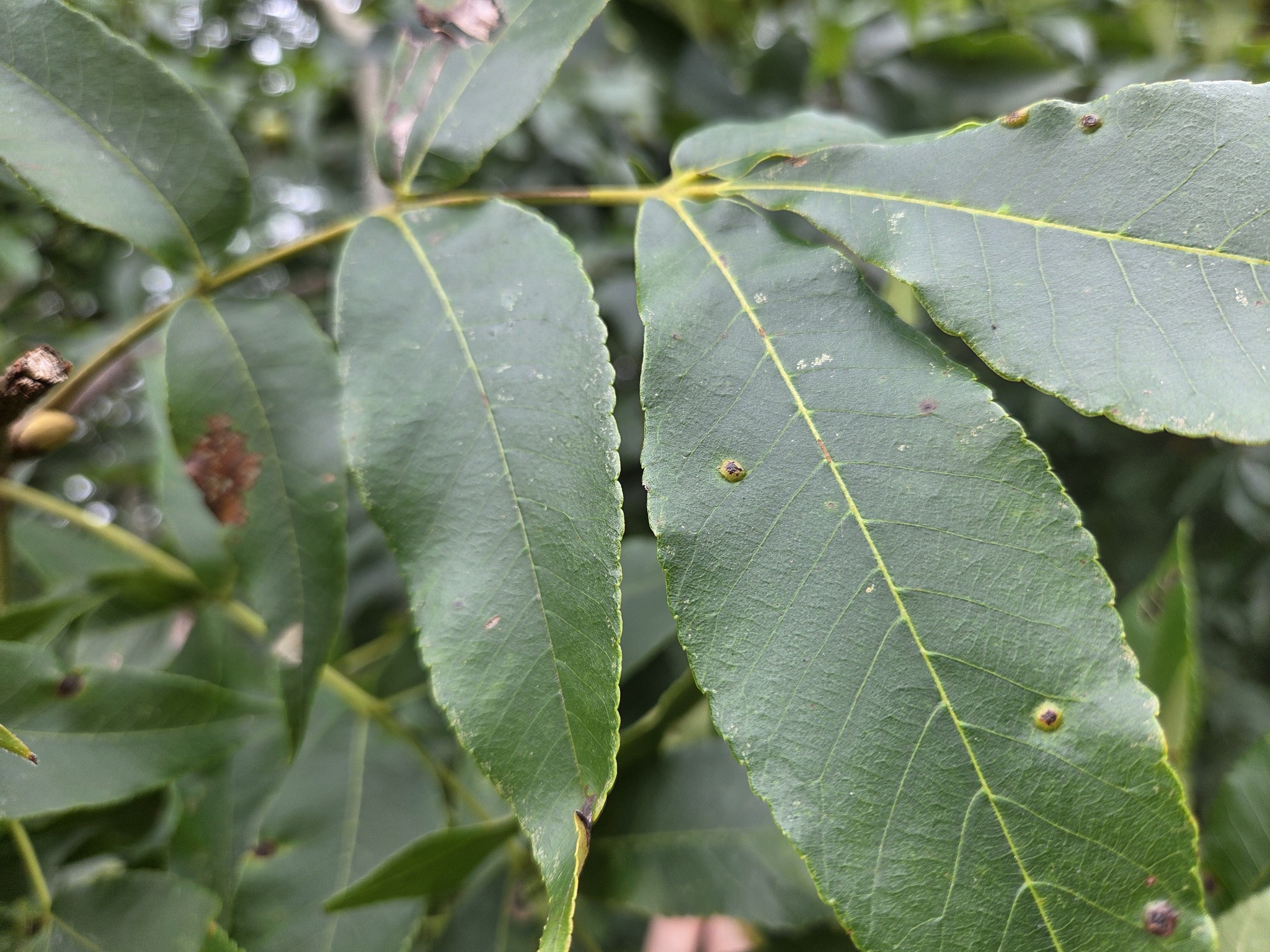 Hickory Bullet Galls on a Mockernut Hickory leaf in Howard Co., Maryland (10/2/2014). Confirmed by Charley Eiseman/BugGuide.