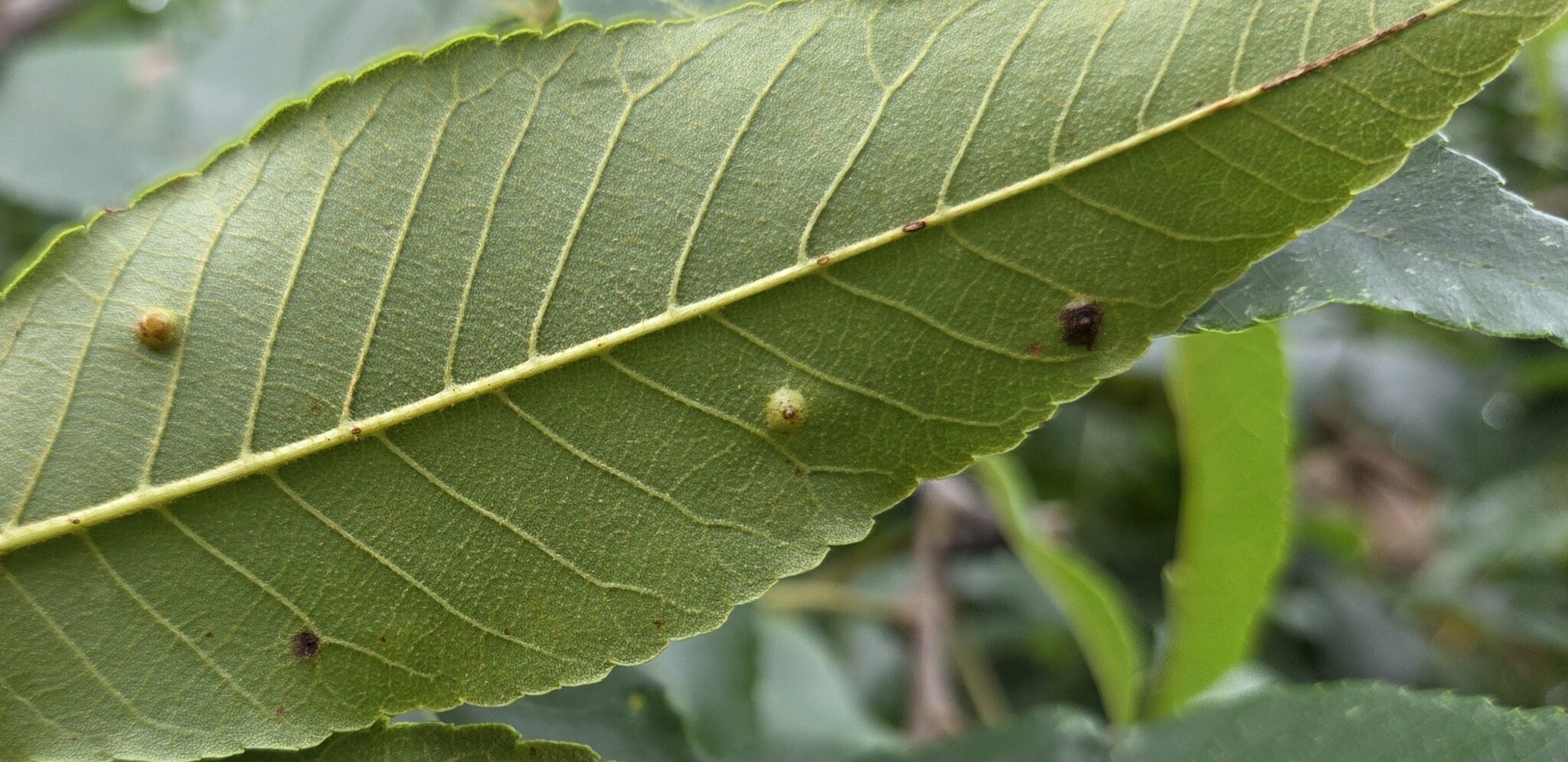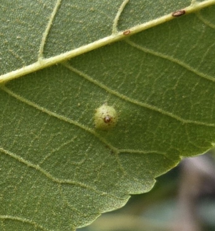 These galls grow on the undersides of hickory (Carya) leaves.