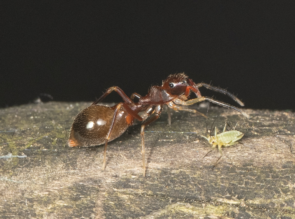 Synemosyna formica is a species of ant-mimicking jumping spider.[1][2][3][4][5] It is found in the eastern United States and parts of Canada.[5] The first pair of legs are elevated to imitate ant antennae, unlike other ant mimics such as the genus Synageles which use their second pair of legs.[6]