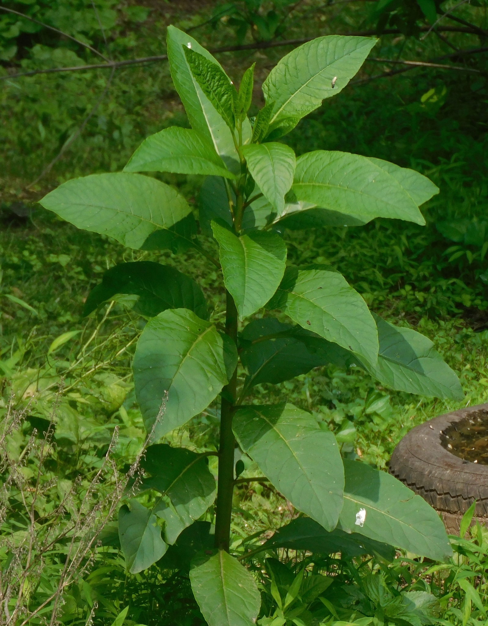 Pokeweed is a member of the family Phytolaccaceae, and is a large herbaceous perennial plant,[9] growing up to 2.5 metres (8 feet) in height over the course of a summer.[9] One to several branches grow from the crown of a thick, white, fleshy taproot; Michael D. K. Owen describes the branches as "stout, smooth, [and] green to somewhat purplish". Simple, entire leaves with long petioles are alternately arranged along the stem.[9]