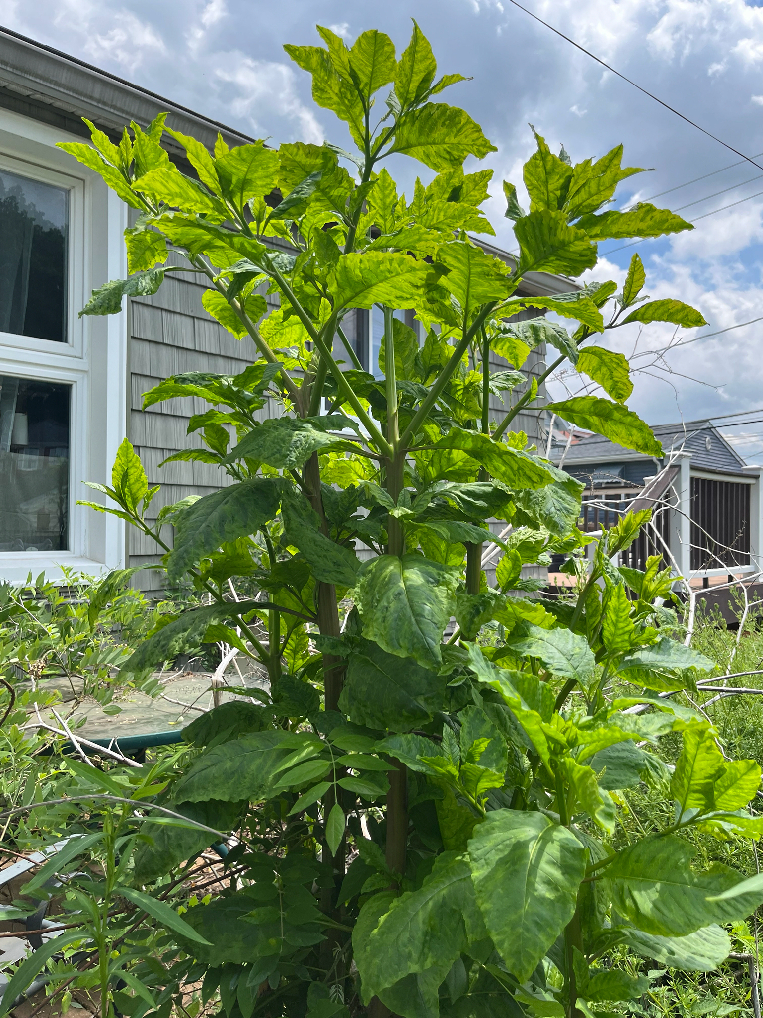 Leaves: The leaves are alternate with coarse texture with moderate porosity. Leaves can reach 41 centimetres (16 inches) in length. Each leaf is entire. Leaves are medium green and smooth, with a distinct odor that many characterize as unpleasant.