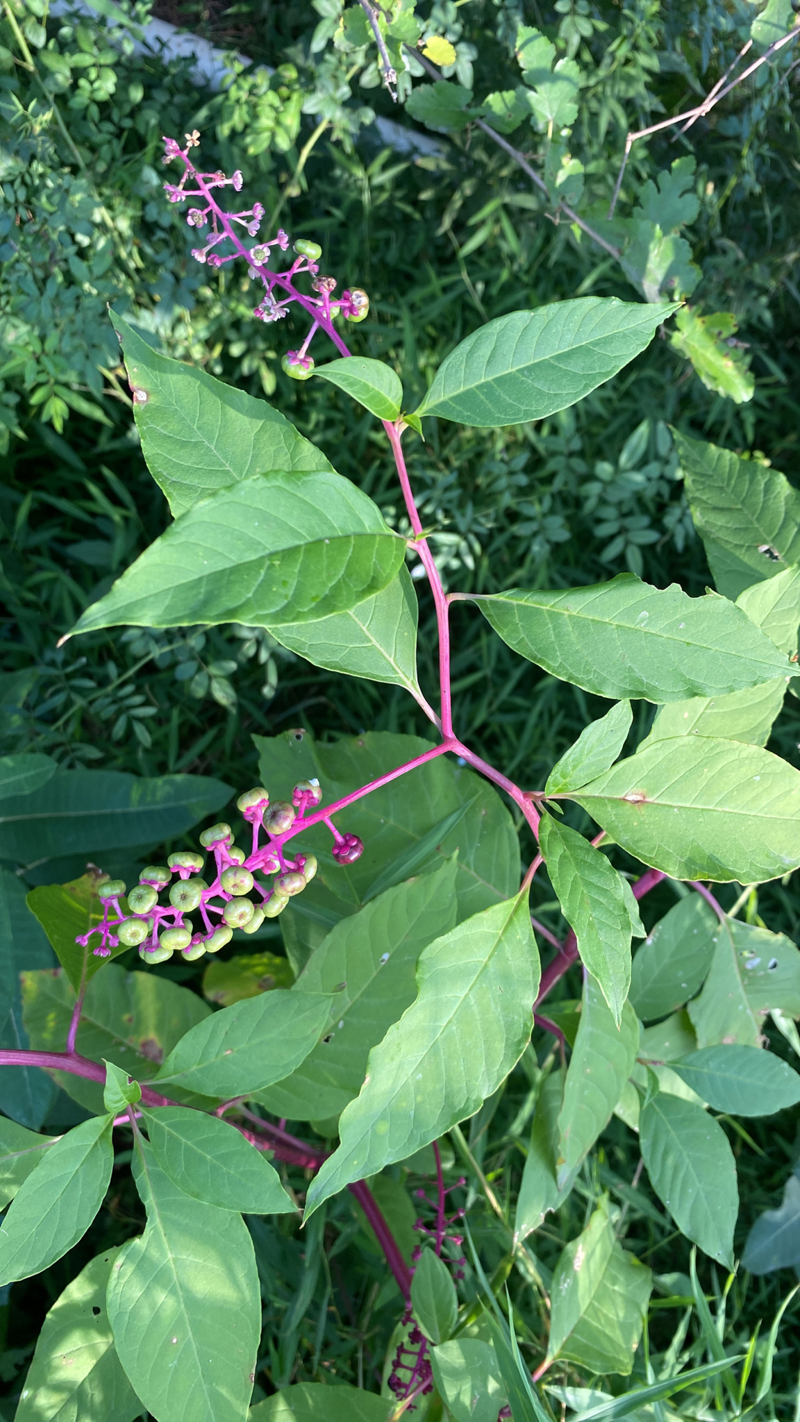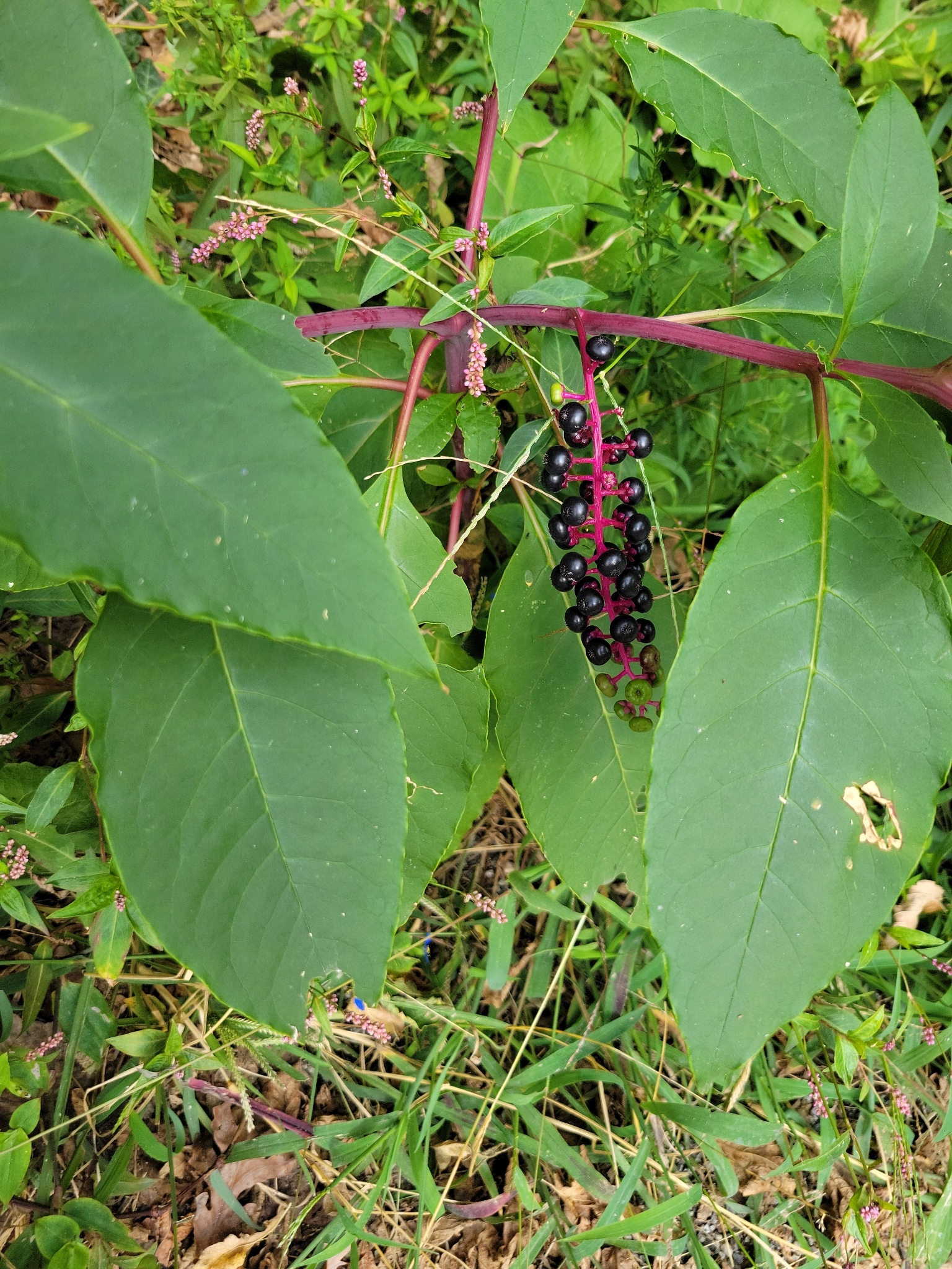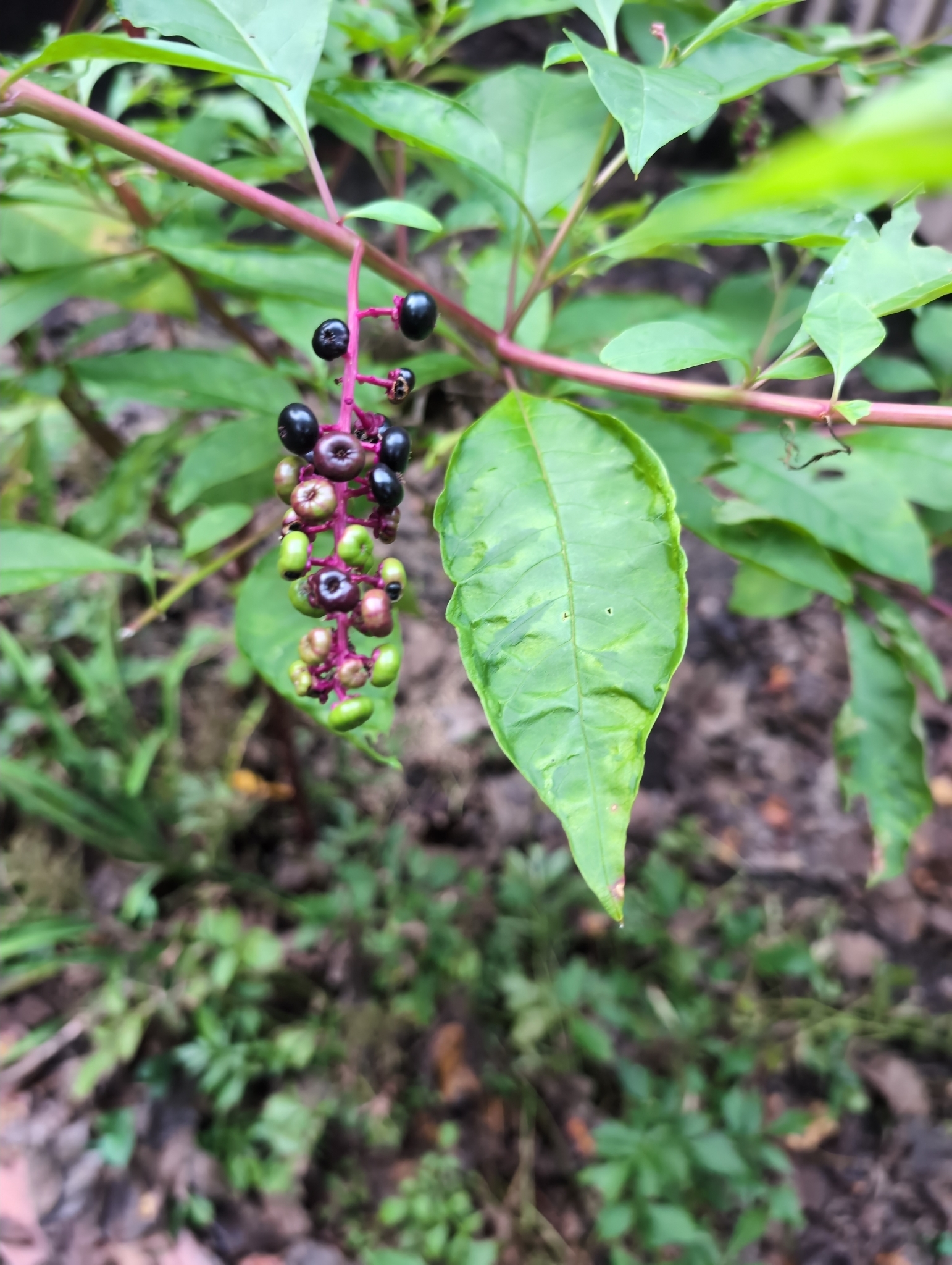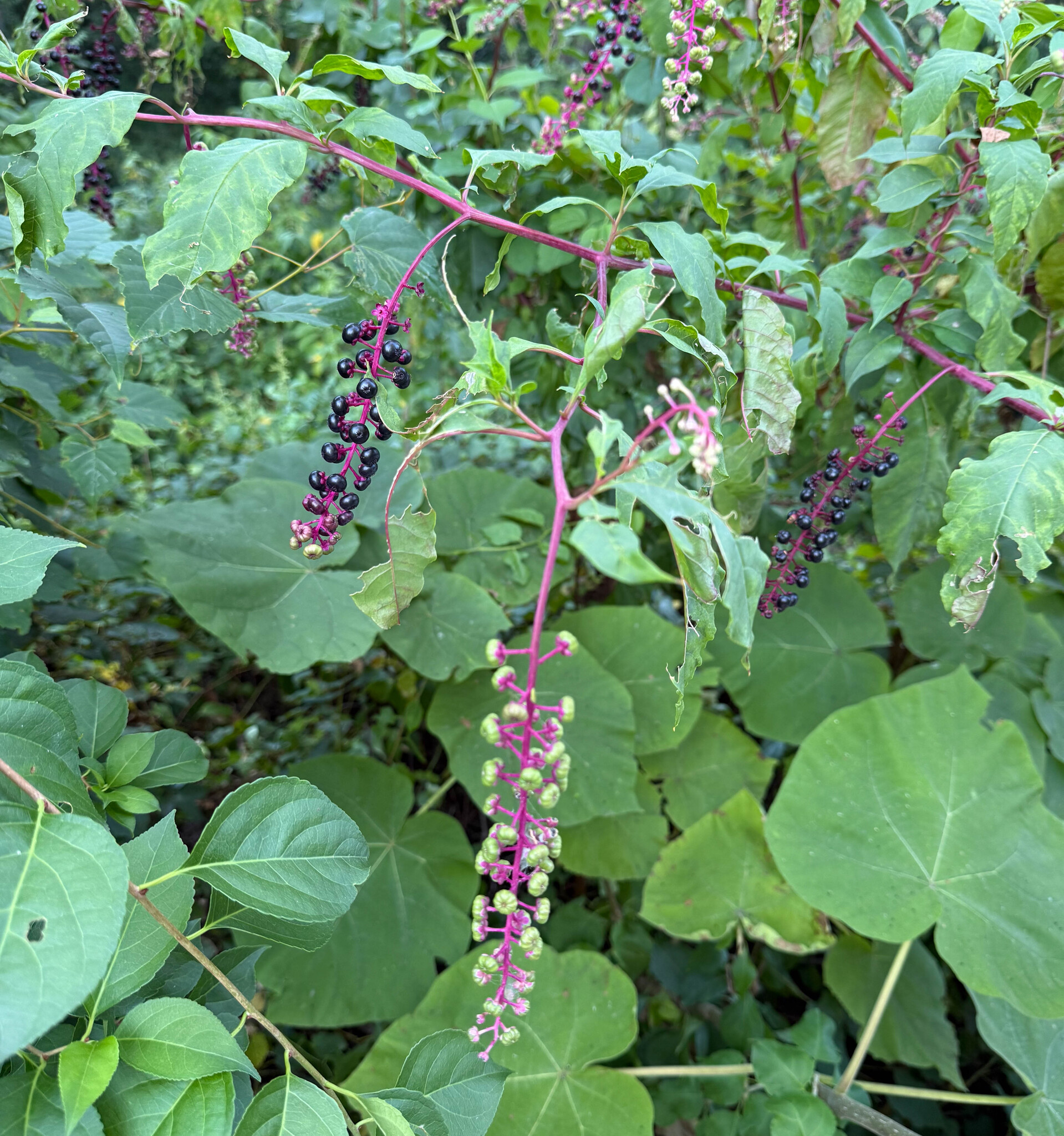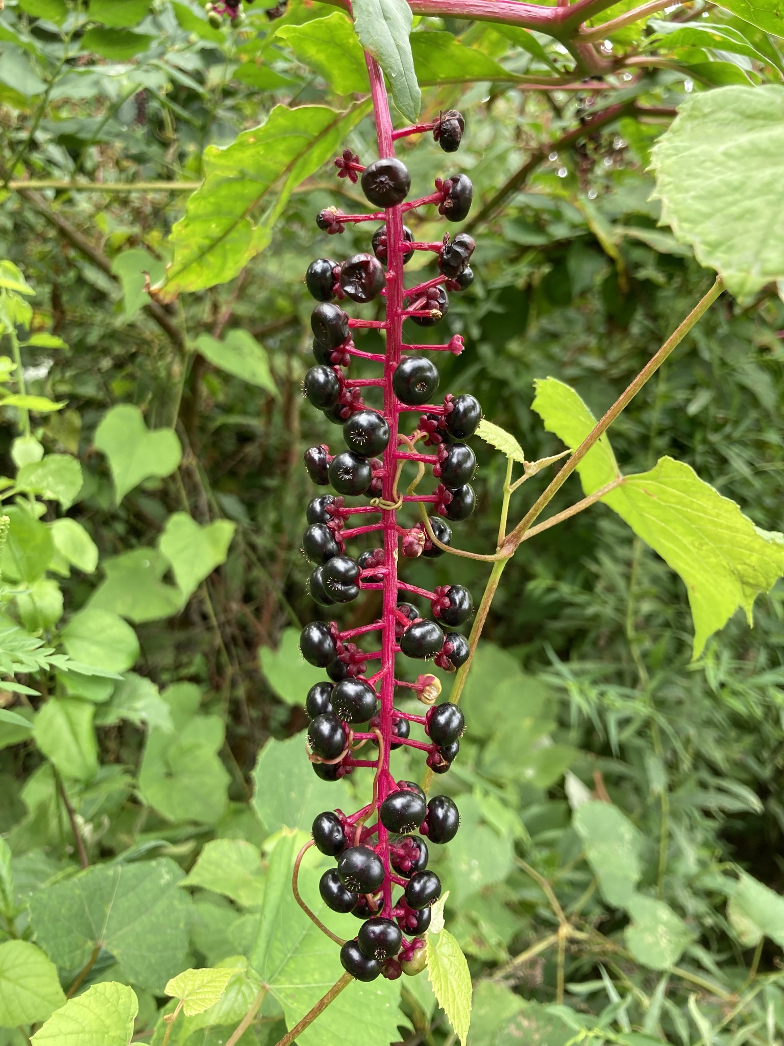Phytolacca americana, also known as American pokeweed, pokeweed, poke sallet, pokeberry, dragonberries, pigeonberry weed, and inkberry, is a poisonous, herbaceous perennial plant in the pokeweed family Phytolaccaceae. This pokeweed grows 1 to 3 metres (4 to 10 ft).[4] It has simple leaves on green to red or purplish stems and a large white taproot. The flowers are green to white, followed by berries which ripen through red to purple to almost black which are a food source for songbirds such as gray catbird, northern mockingbird, northern cardinal, and brown thrasher, as well as other birds and some small non-avian animals (i.e., for species that are unaffected by its mammalian toxins).