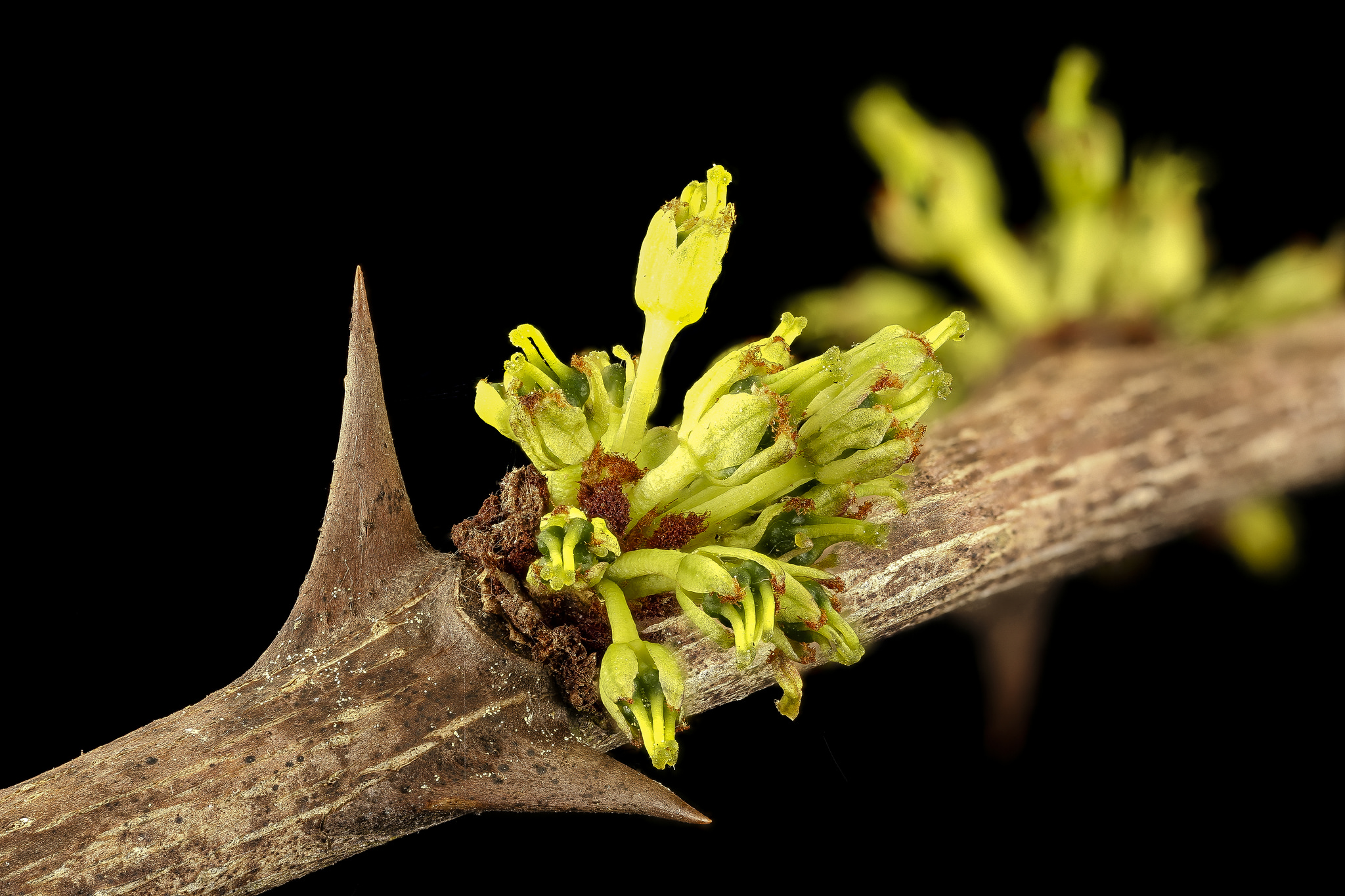 Zanthoxylum parvum flowers in late March until early April, before its leaves have expanded fully. Although foliage is present throughout most of the year it eventually becomes deciduous and turns yellow in mid-October.