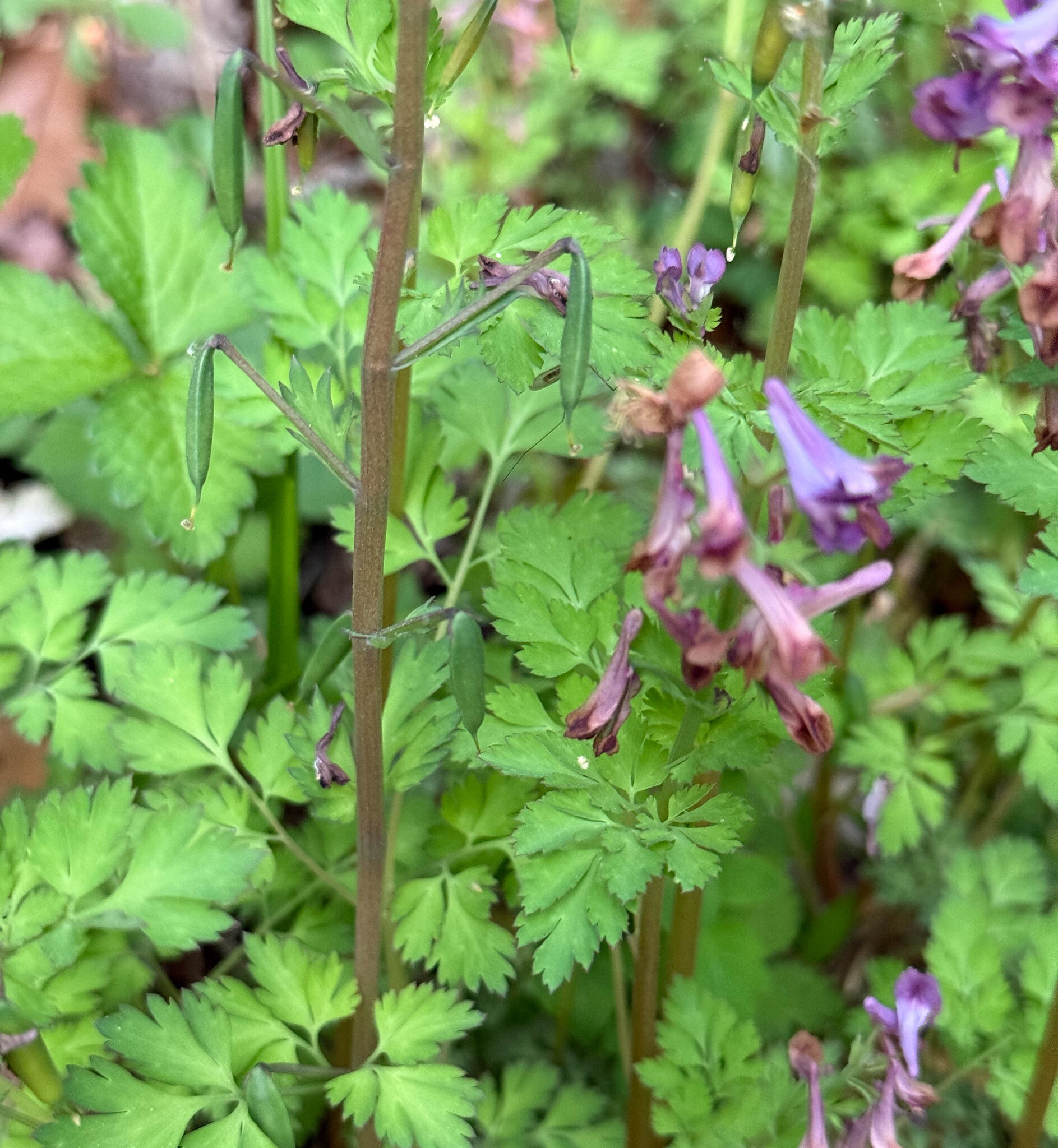 [edit]Corydalis incisa grows up to 2 feet (0.61 m) tall. The life cycle begins in spring when seeds germinate and grow into small rosettes supported by a tiny tuber. The leaves are compound and divided into 3 leaflets, and again into another 3 sub-leaflets that are lobed to serrated. The leaves go dormant for the summer and re-emerge directly from the tuber in the fall. They are evergreen throughout winter. Stems emerge in February and blooming occurs from March through early May. There are about 10 to 16 flowers per raceme. The fruits, which are oblong, pod-shaped capsules, form quickly. The first seeds disperse about three weeks after the first flowers. By early summer, the mature plants are dead. Corydalis incisa can be found in waterways, rock walls, disturbed areas, and "mesic and alluvial habitats".[4]