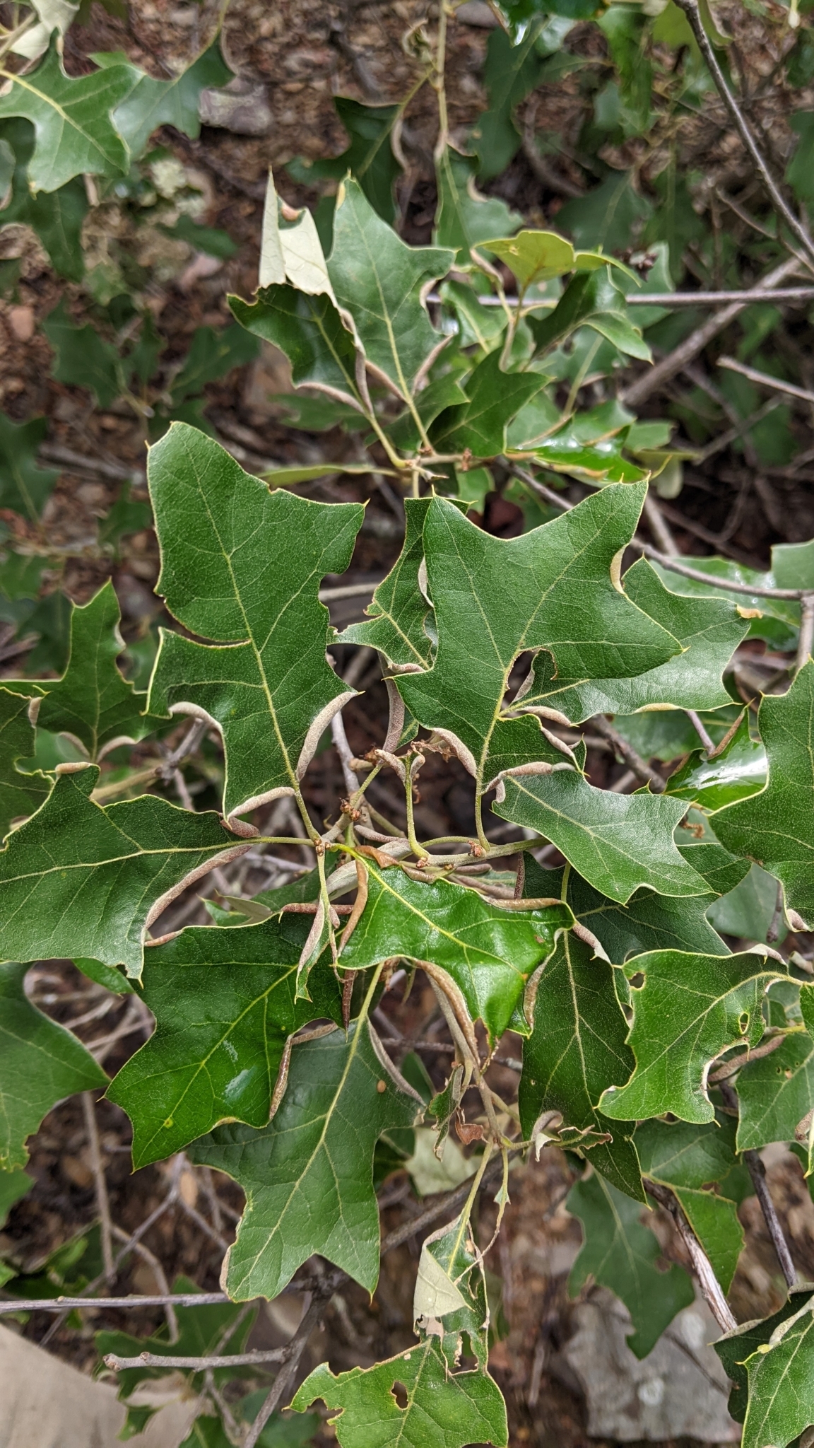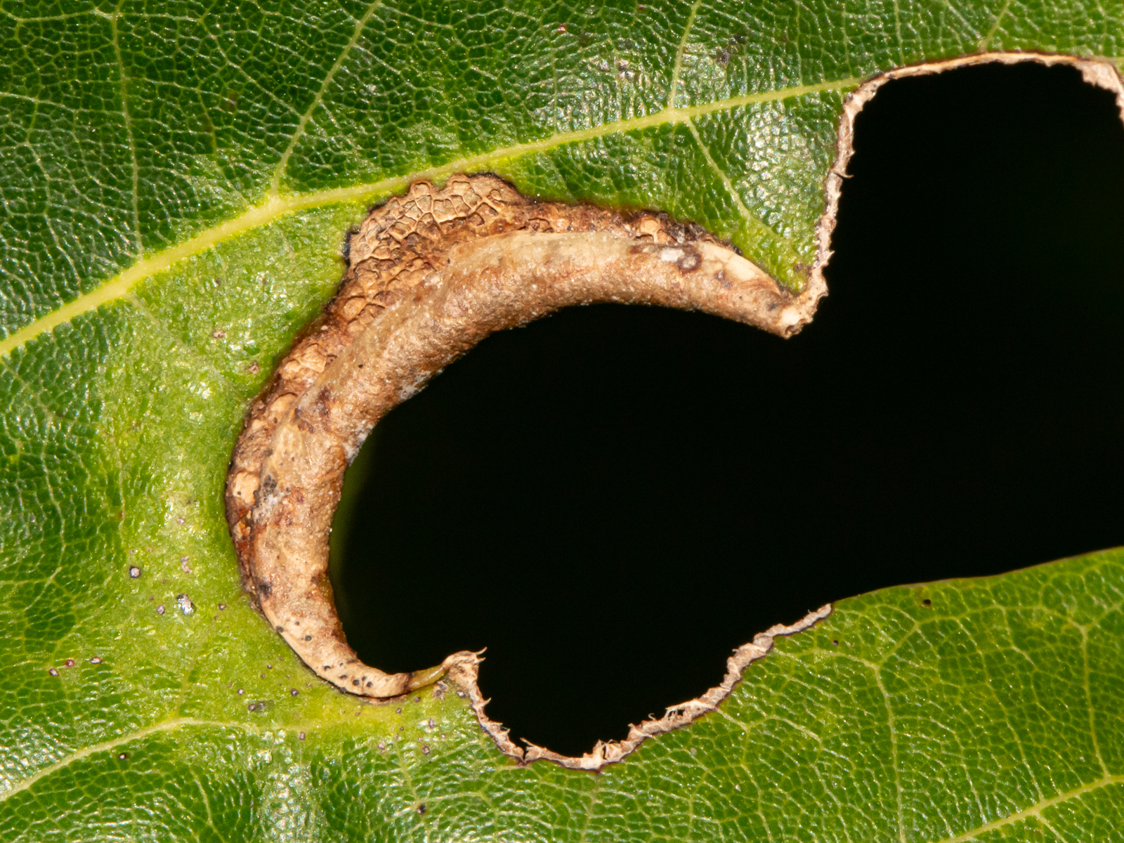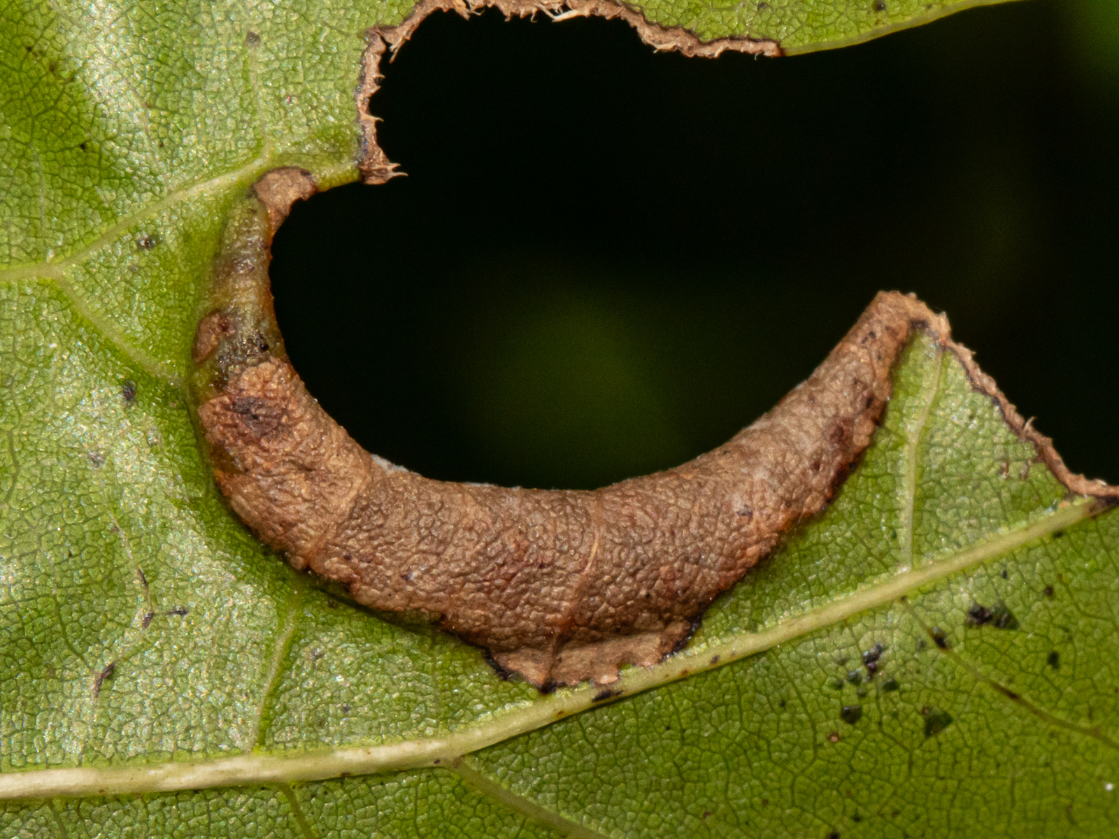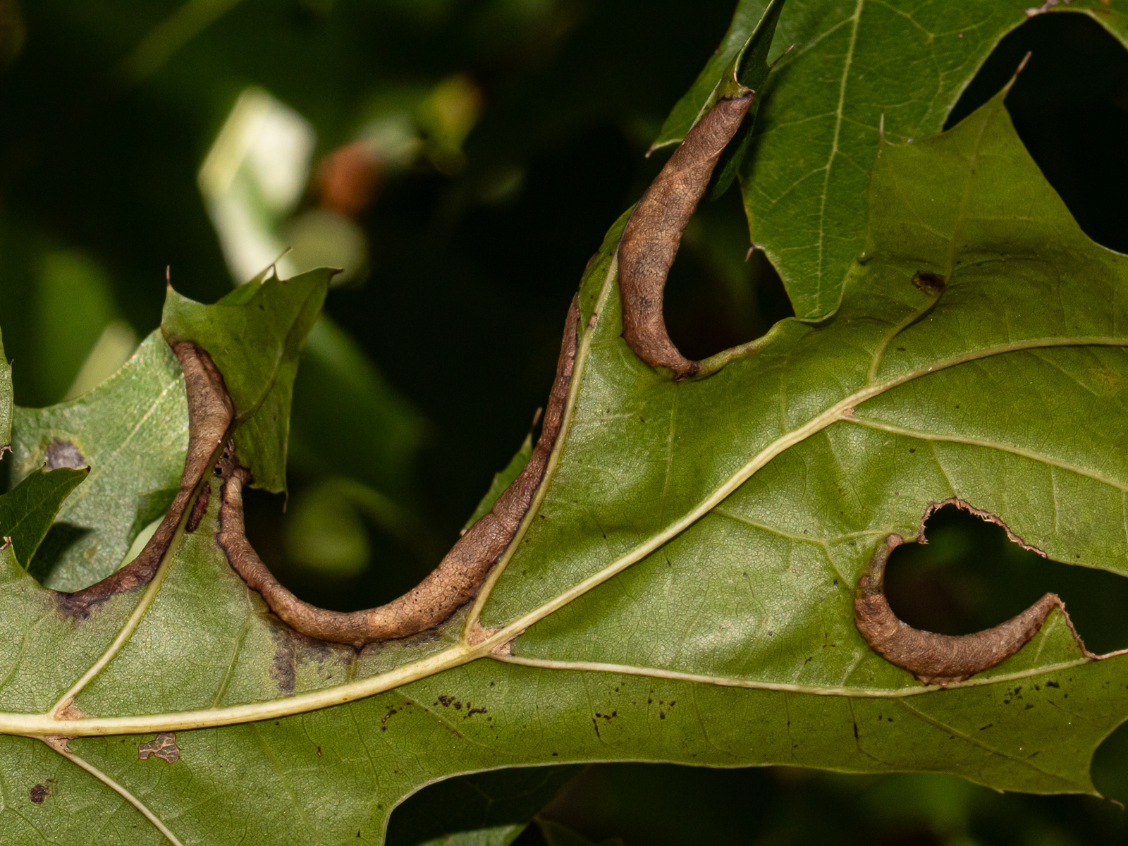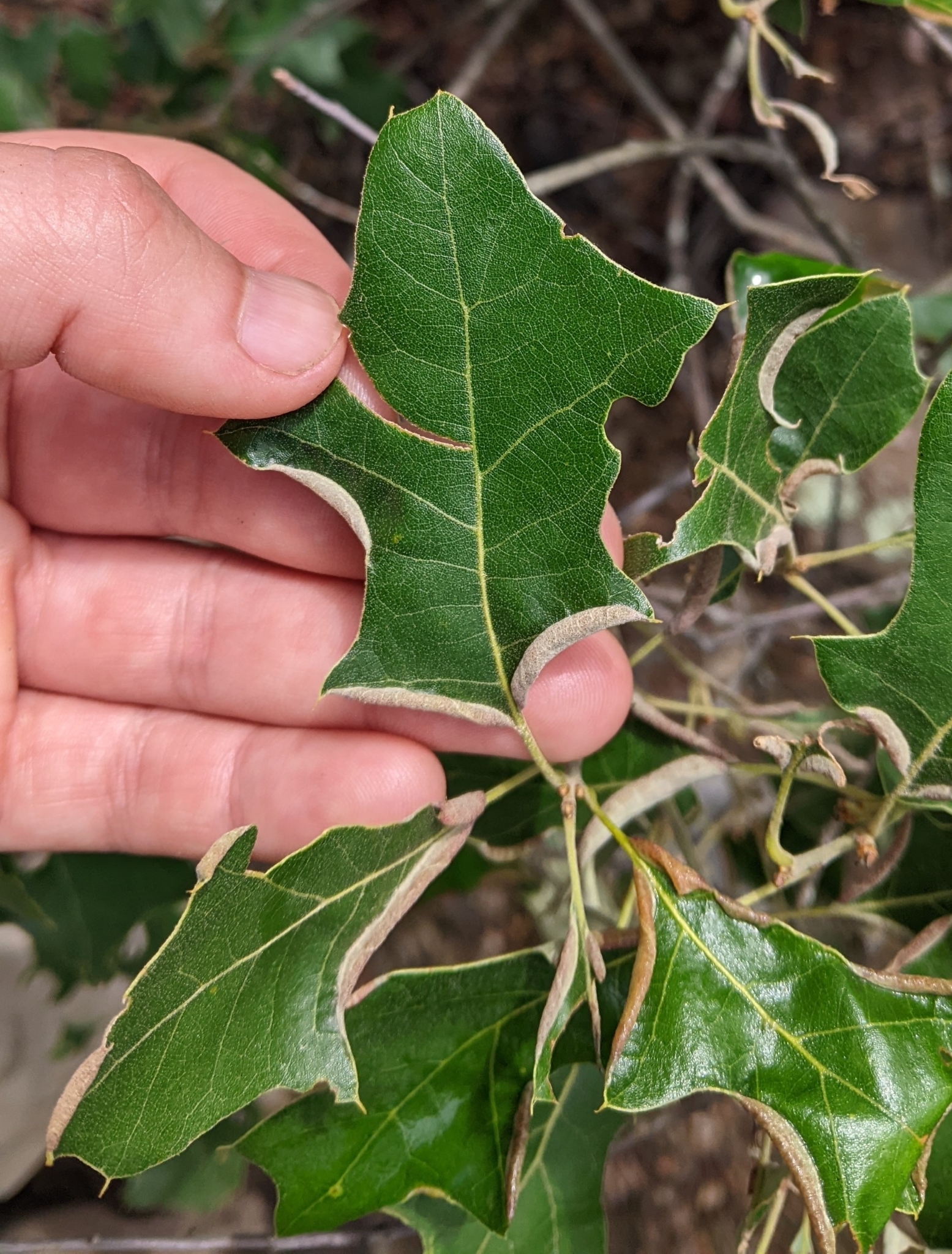 The leaf fold of Macrodiplosis erubescens on an oak leaf in Baltimore City, Maryland (9/5/2013). Determined by Charley Eiseman/BugGuide.