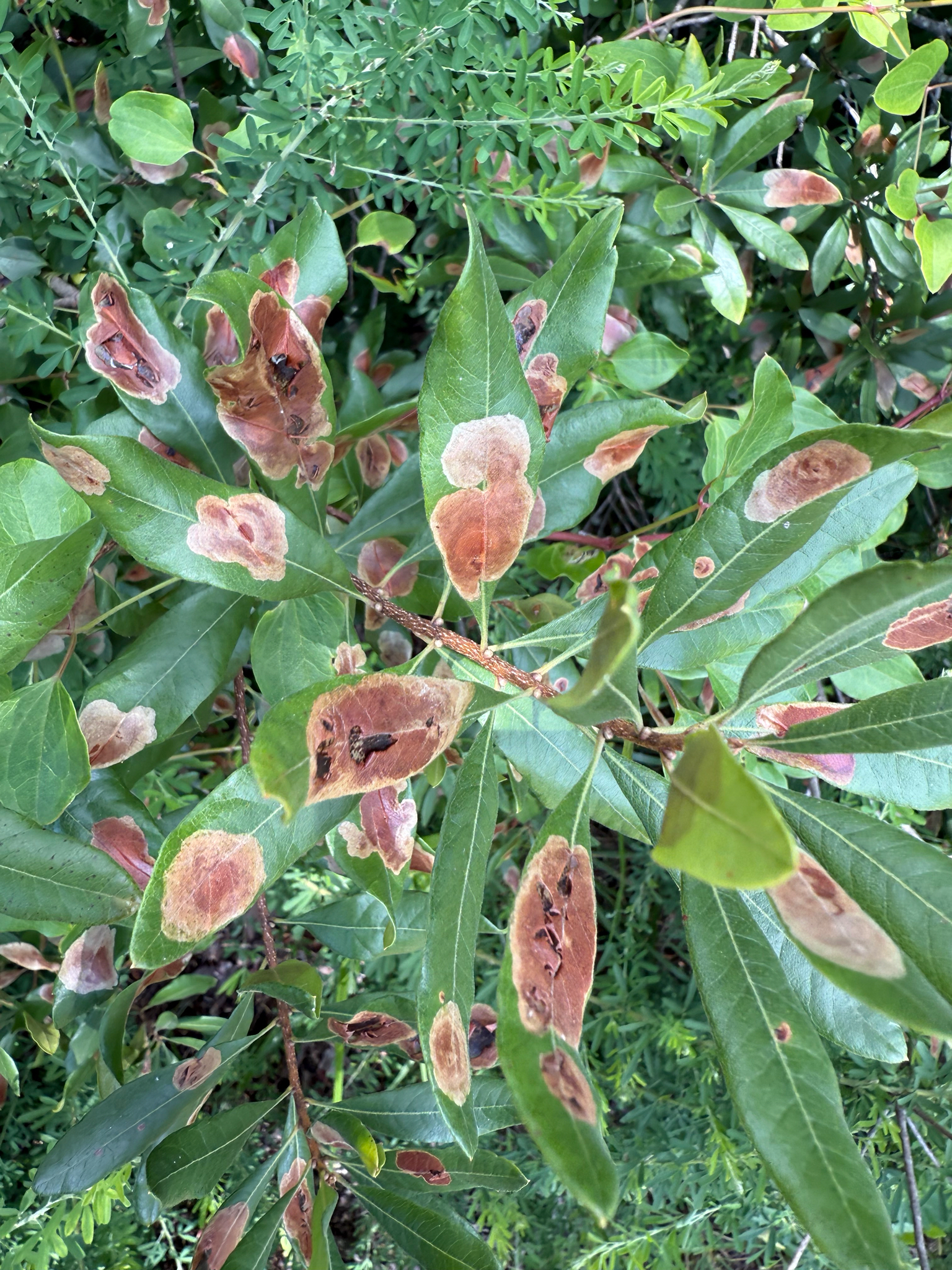 "Larva forms a brownish blotch mine on the upper side of bayberry (Morella [Myrica] pensylvanica and M. caroliniensis) leaves." (BugGuide)