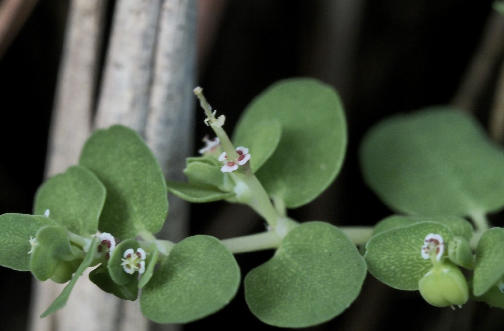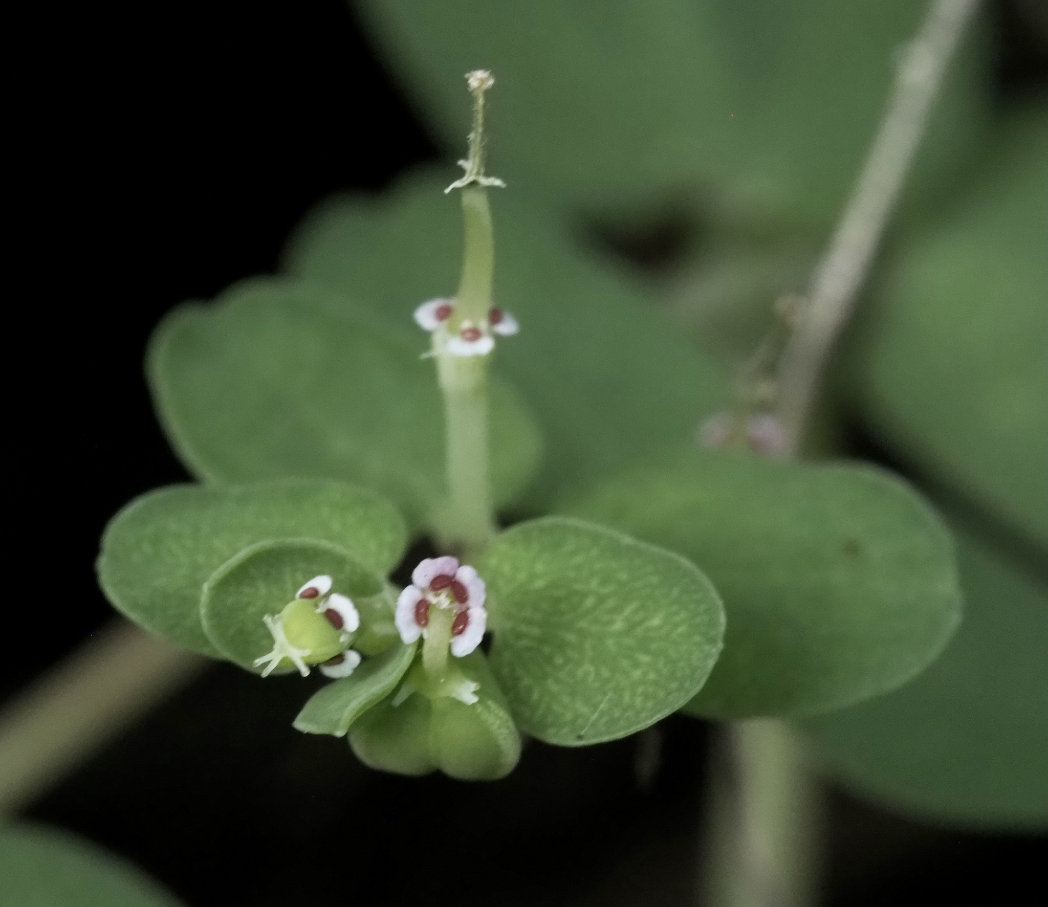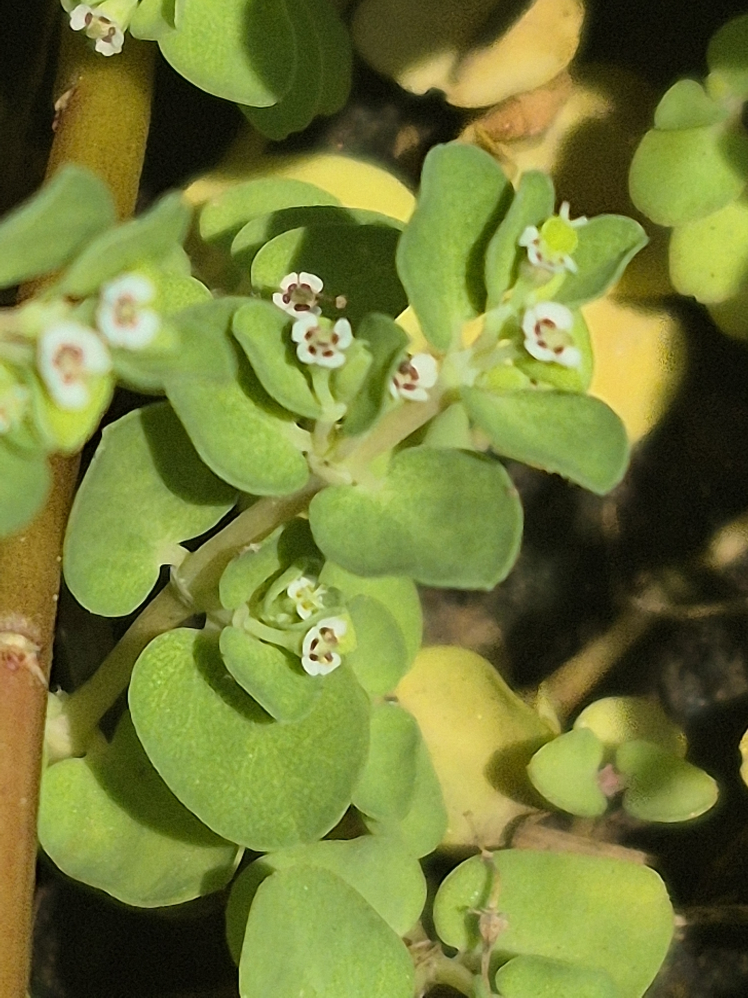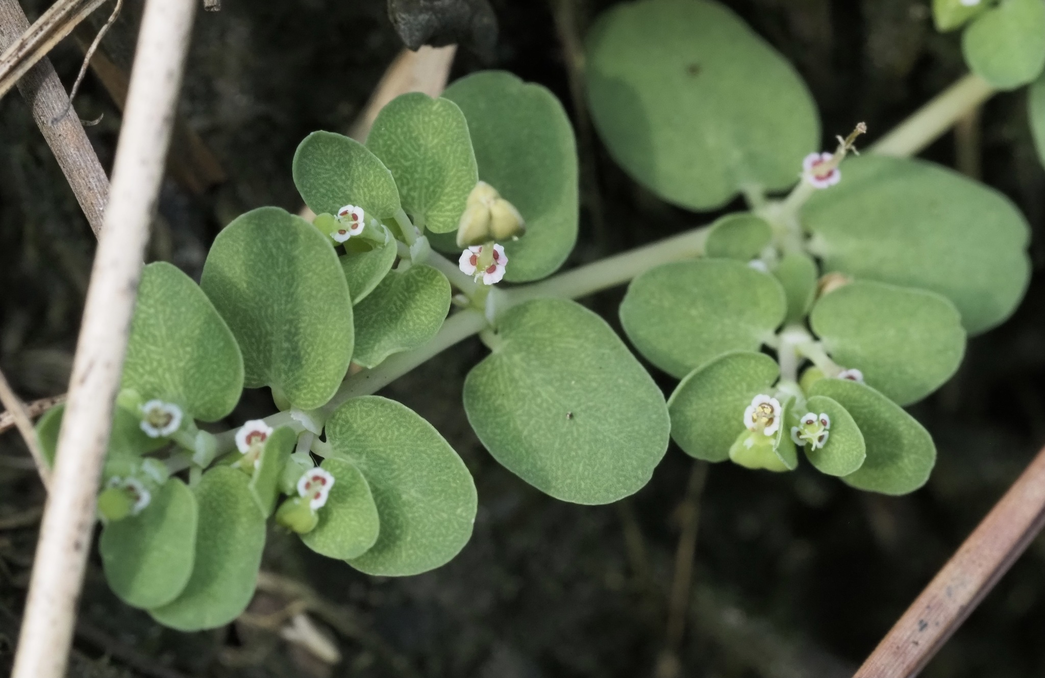 [edit]This is an annual herb forming a mat of prostrate stems which root at nodes where the stem comes in contact with the ground. The oval leaves occur in oppositely arranged pairs, each leaf less than a centimeter long. The inflorescence is a cyathium with scalloped white petal-like appendages surrounding the actual flowers. A red nectar gland is at the base of each appendage, and at the center of the cyathium are several male flowers around one female flower. The fruit is a lobed, spherical capsule.