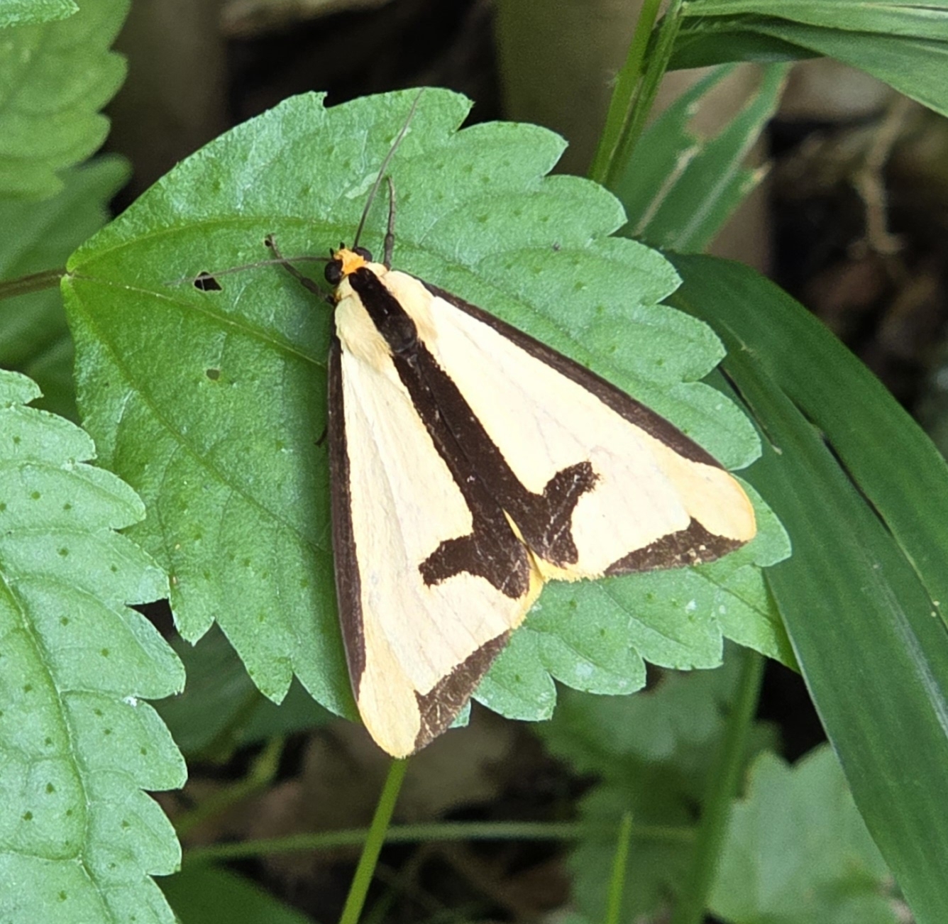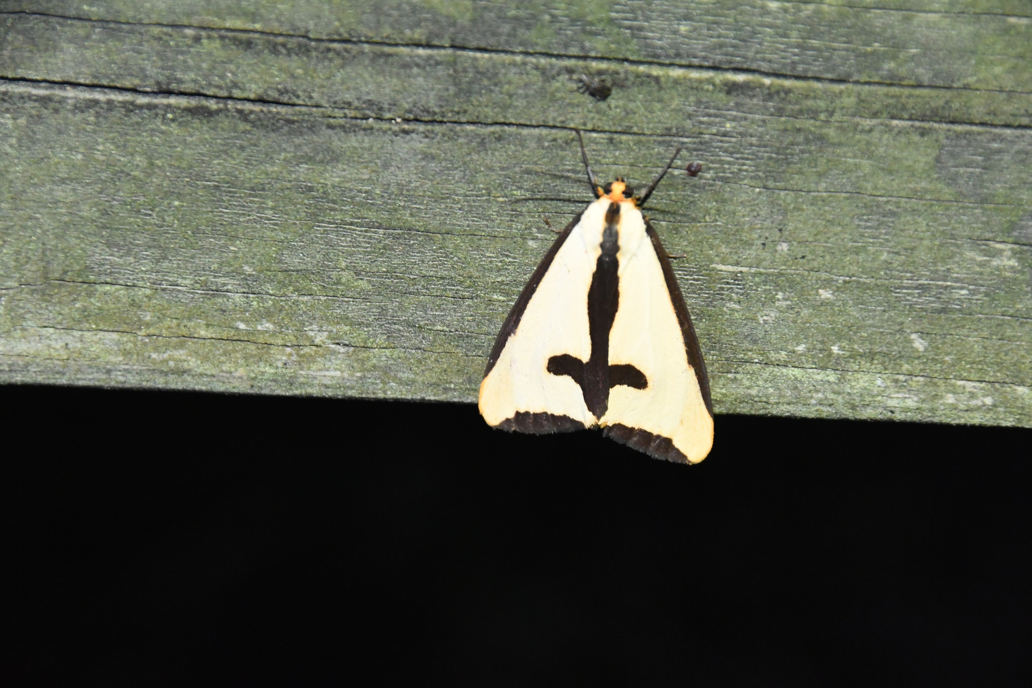 White forewings with dark edges and a dark cross pattern, coupled with orange hindwings are diagnostic field marks. According to the Moths of North Carolina, Clymene Moths do not have an all white wing form like other Haploa species. Orange hindwings narrow your choices to Colona Moth and Clymene Moth.