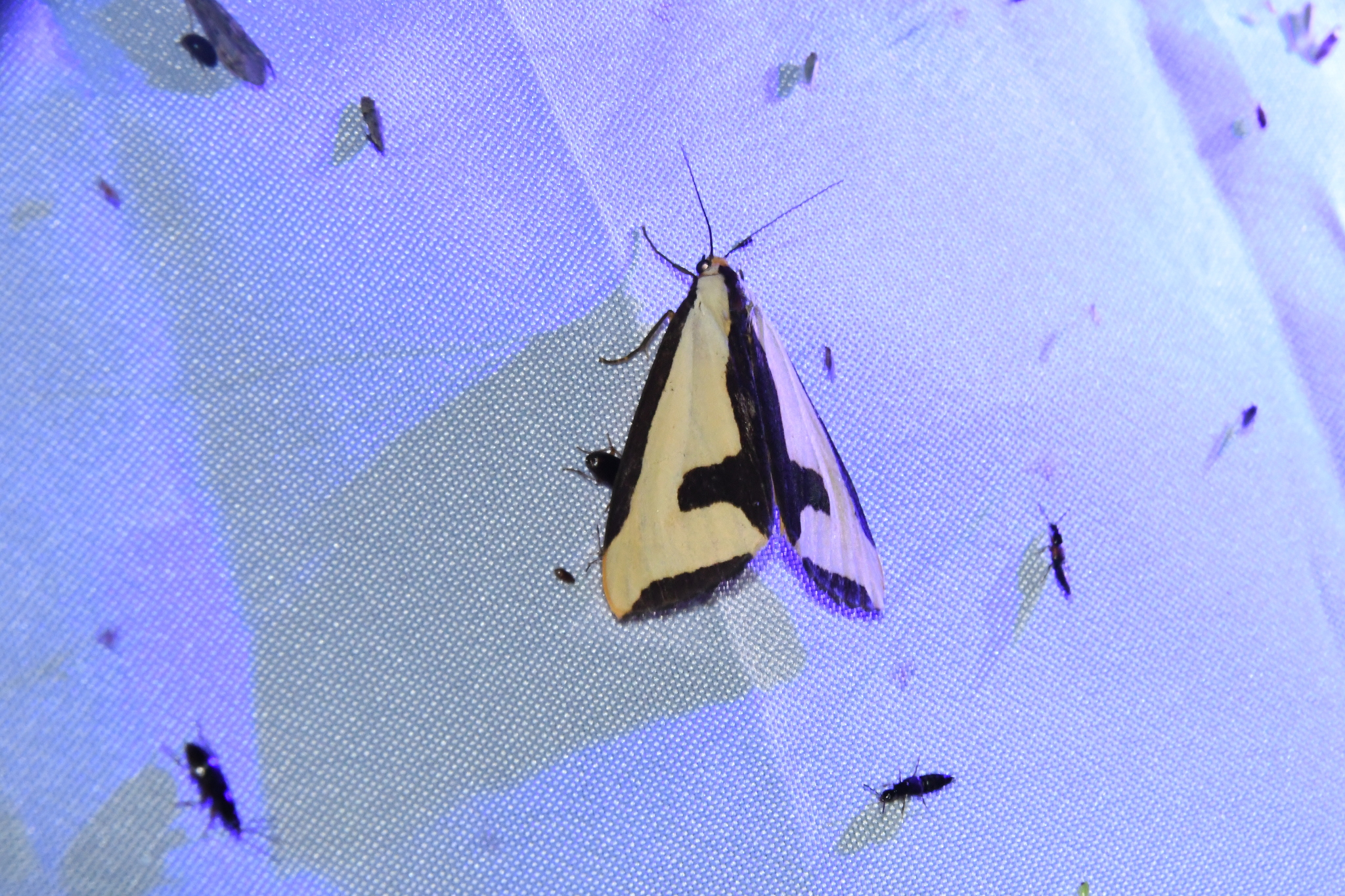 Haploa clymene, the Clymene moth, is a moth of the tiger moth subfamily - Arctiinae, tribe Arctiini. The species was first described to Western science by Peter Brown in 1776. It is found in eastern North America.