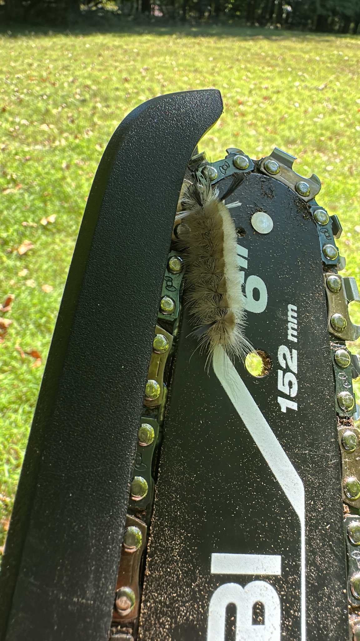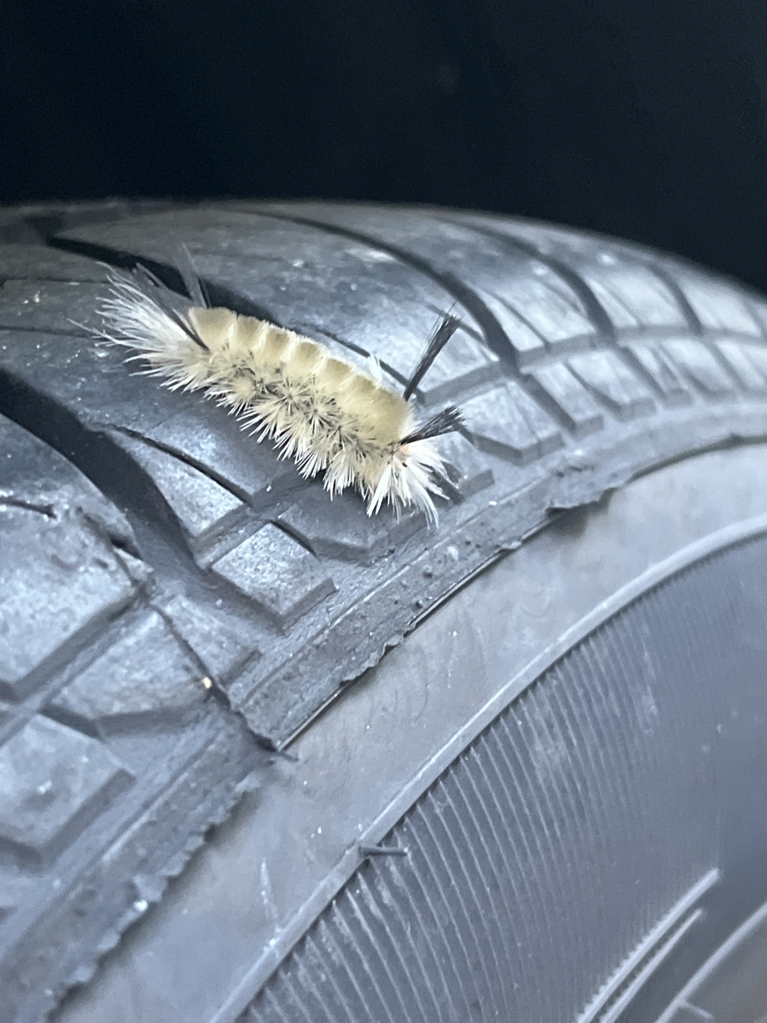 [edit]Caterpillars are covered with long setae, in tufts. They vary from yellowish and orange through dark gray. Extra long hair-pencils of white, black, and/or orange occur at both the front and rear of a caterpillar. Larval head capsules are bright orange. In the north, mature caterpillars are found from July to frost.[4] Caterpillars frequently rest on the upper surface of leaves, and though not gregarious, they are very conspicuous.[4] They grow to a length of up to 1.75 inches (44 mm).[6] The hairs are urticating and easily dispersed by the caterpillar.[7]