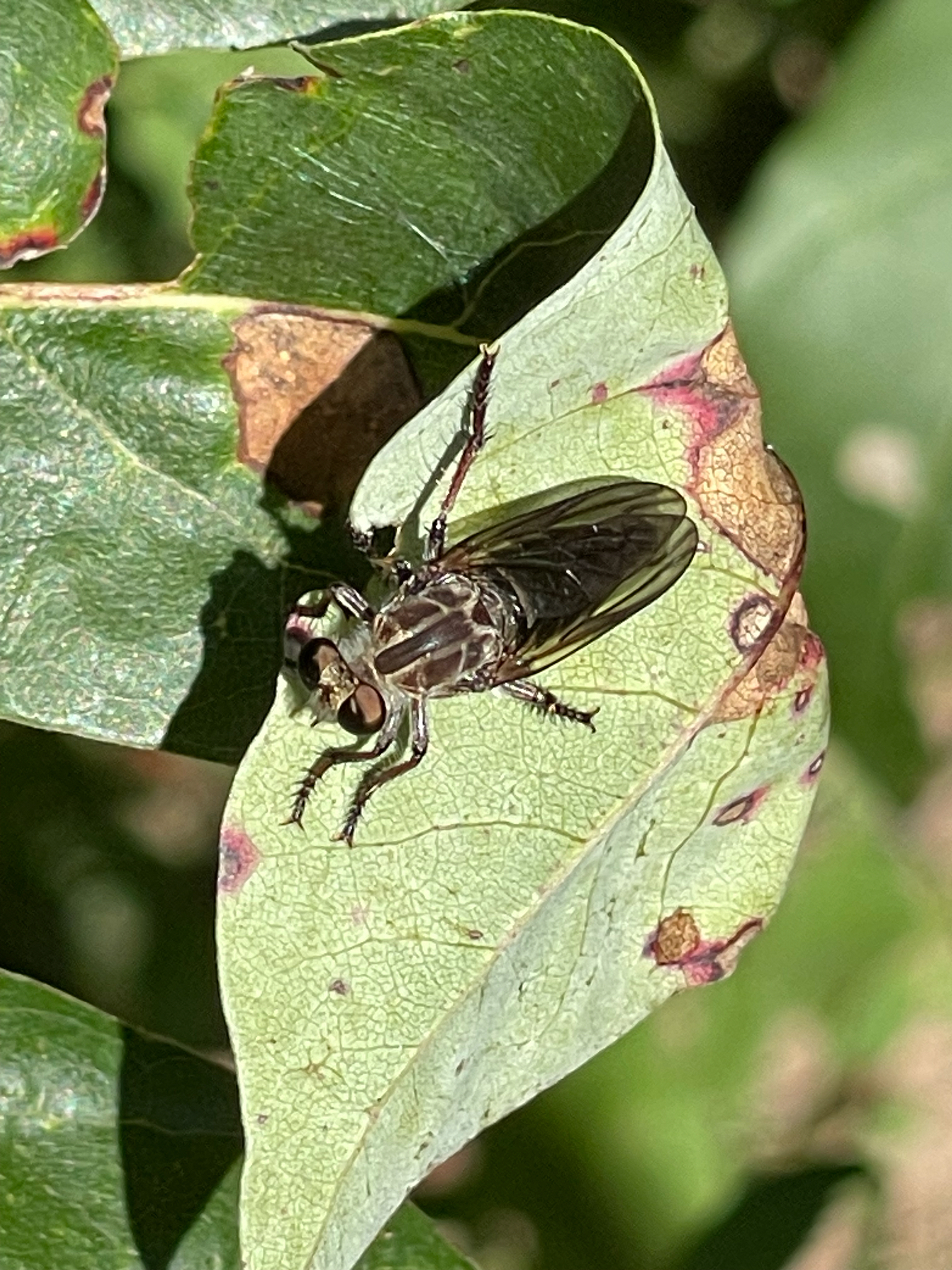 Heteropogon macerinus is an eastern representative of a genus that reaches its greatest diversity in the west and southwest. This late summer-fall species apparently favors forest edges, where it perches on branch tips at roughly eye level. It has an interesting courtship flight display (Norm Lavers' robber fly site).