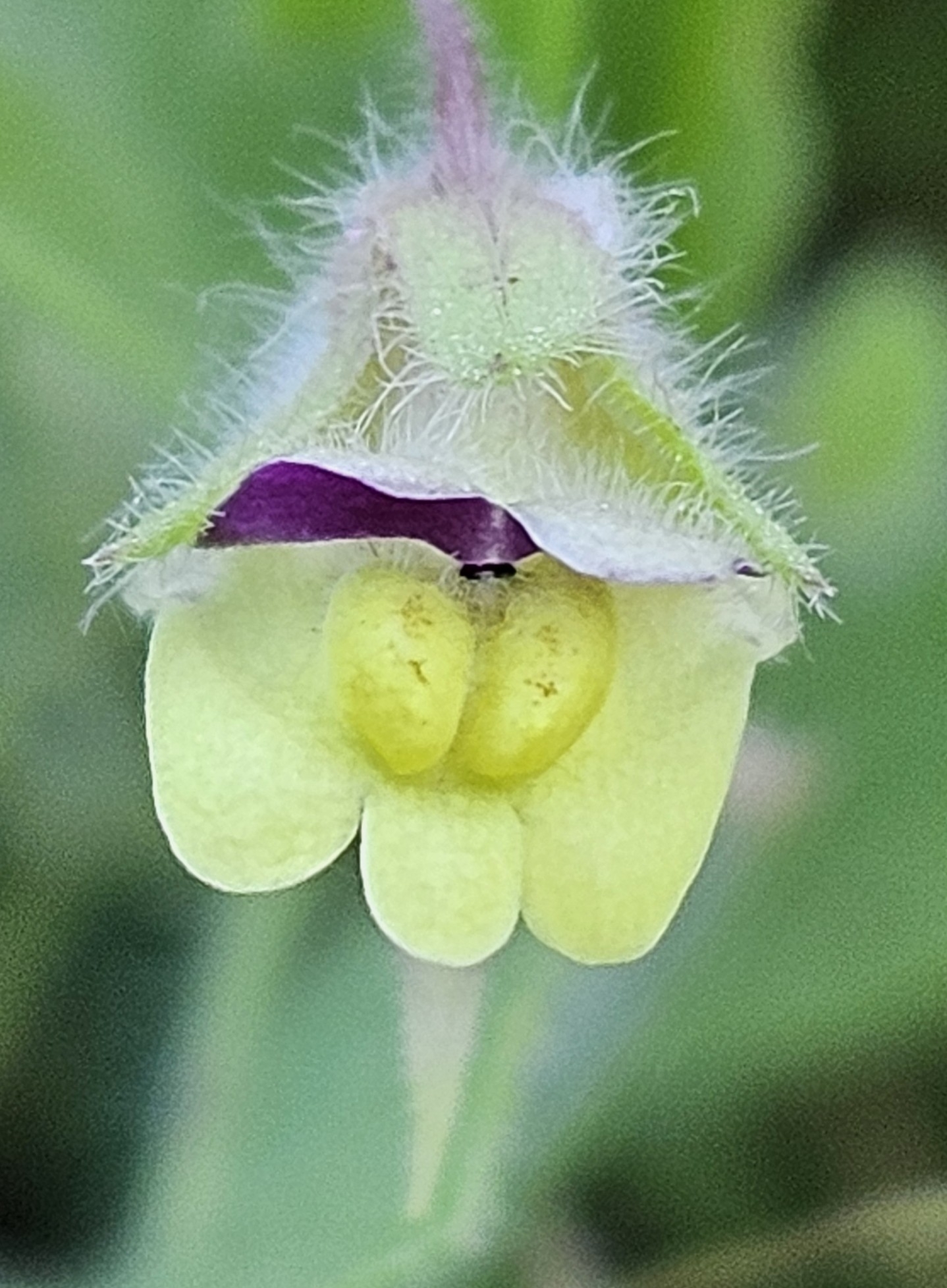 [edit]This is a small hairy herb with a trailing stem with many branches. It produces oval to arrowhead-shaped fuzzy leaves at wide intervals along the slender stem, and solitary snapdragon-like spurred flowers borne on long, straight pedicels. Each flower is up to 1.5 centimeters long with a narrow, pointed spur extending from the back.[3] The lobes of the mouth are yellow, white, and purple, and the whole flower is fuzzy to hairy, except for the flower stalk, which is more or less bare, in contrast to Kickxia spuria which has a hairy flower stalk. The fruit is a spherical capsule about 4 millimeters long.