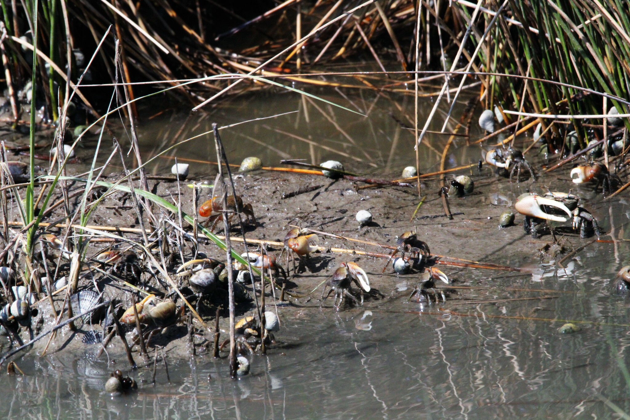 Minuca minax, commonly known as the red‐jointed fiddler crab or brackish-water fiddler crab,[1] is a species of fiddler crab that is found in the United States from Massachusetts to the Gulf of Mexico. It is one of the most common macroinvertebrates in salt marshes in these states.[2] It prefers areas of lower salinity than other fiddler crabs,[3] and can be found in great numbers along the banks of tidal streams, even at distances greater than 50 km (31 mi) from the sea.[4]