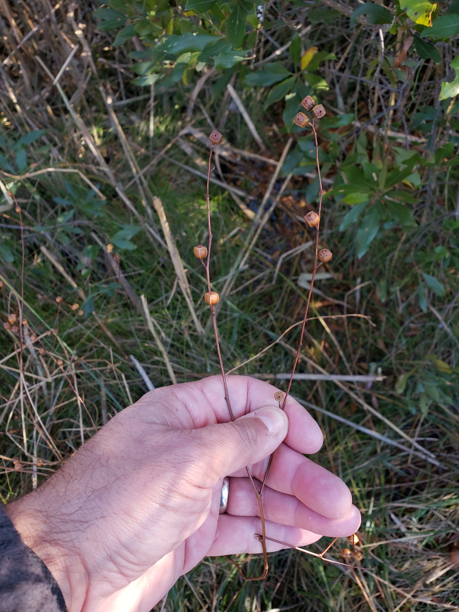 Flowers are usually single, growing from the leaf axils on upper leaves. They have four yellow petals and four light green sepals.[9] The mature fruits are brown, cubic capsules with rigid sides, about 0.25 in (0.6 cm) in length.[8]