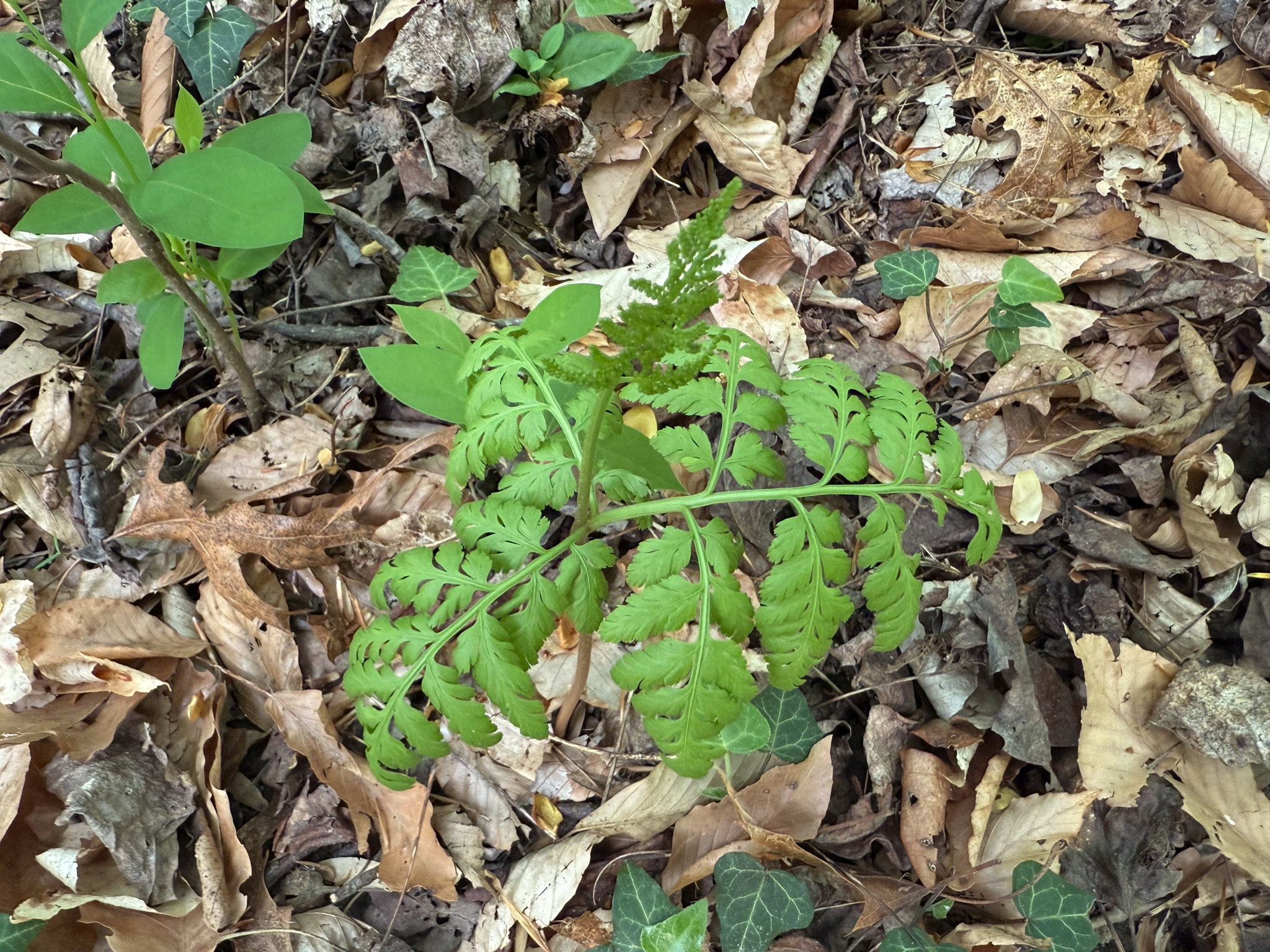 Rattlesnake fern has separate fertile and sterile leaves, when present the sterile leaf arises halfway up the stalk and the fertile leaf exists at the tip. The spores are shed in late spring. Like other ferns rattlesnake fern undergoes alternation of generations and the form described in this article is the sporophyte.