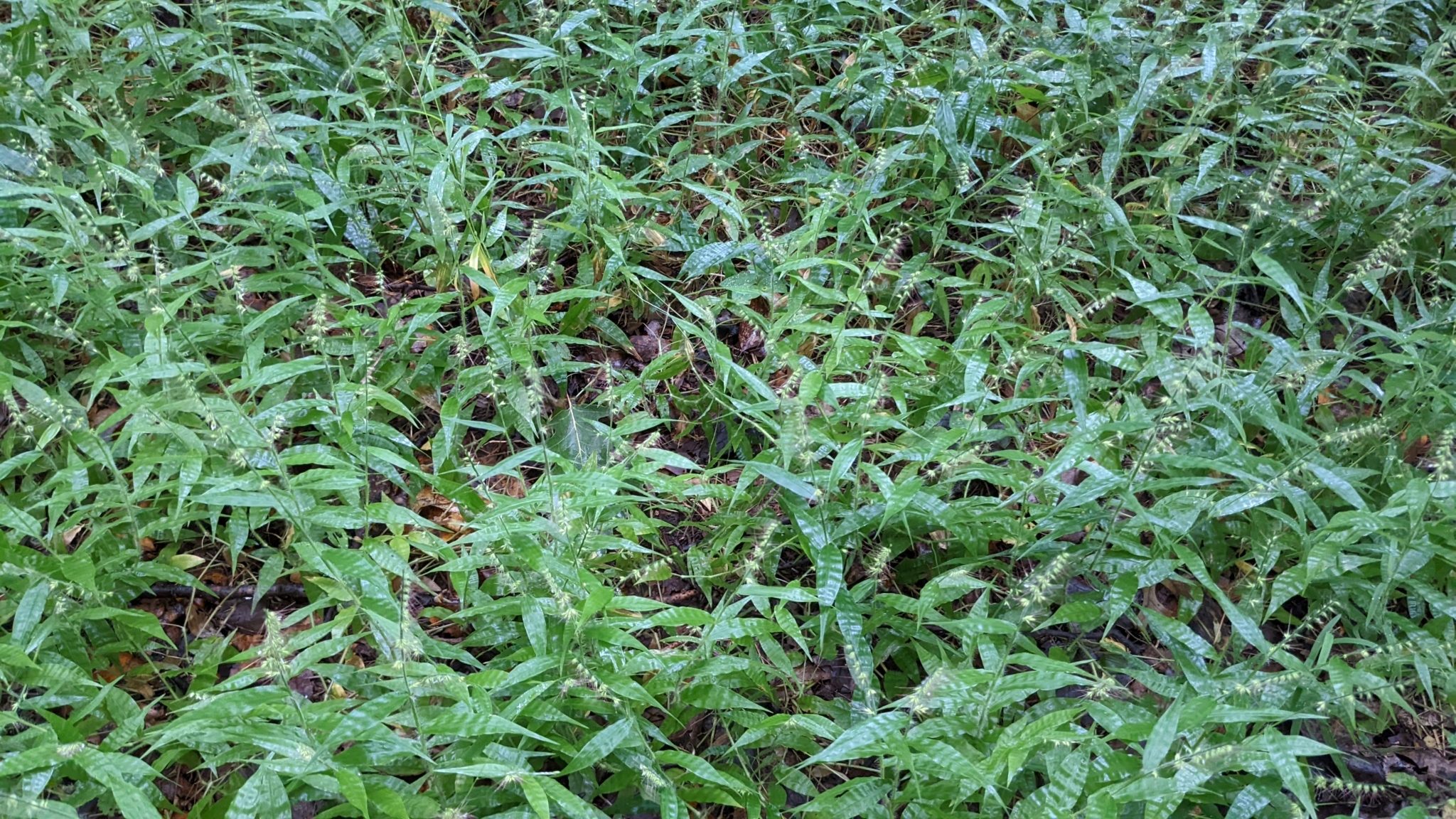 Wavyleaf basketgrass infestation. Habitat: closed-canopy mesic forest in Maryland, United States.