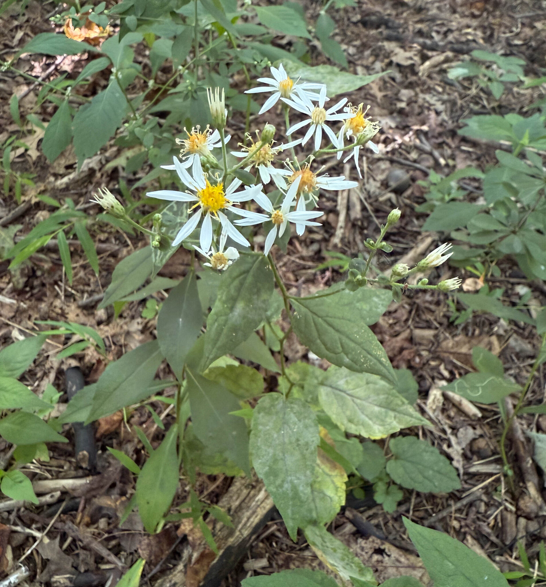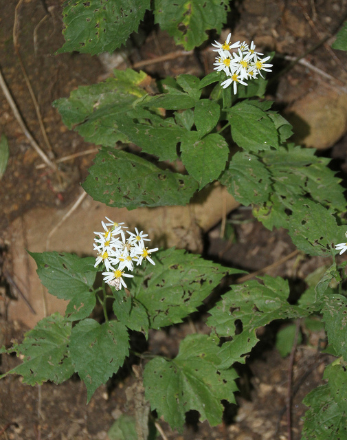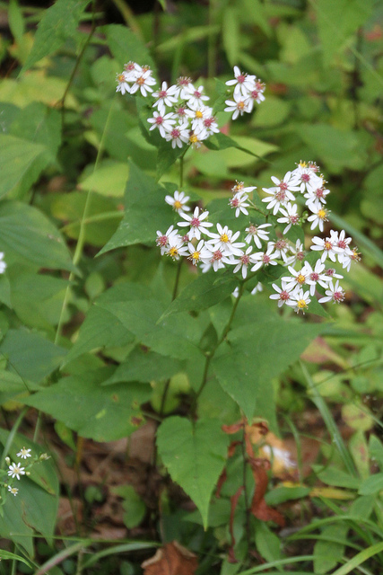 Two other superficially similar plants include the bigleaf aster (Eurybia macrophylla) and the heartleaf aster (Symphyotrichum cordifolium), though both usually have blue or pale blue rays, while those of E. divaricata are always white. Both species sometimes have white rays in rare cases, but E. macrophylla can still be distinguished by its larger and broader leaves and S. cordifolium by its straighter and branched stems.[5][6]