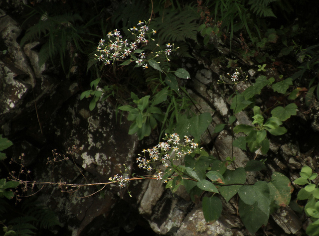 Eurybia divaricata (syn. Aster divaricatus), the white wood aster, is an herbaceous plant native to eastern North America. It occurs in the eastern United States, primarily in the Appalachian Mountains, though it is also present in southeastern Canada, in the provinces of Ontario, Quebec and Nova Scotia. In the U.S. it is abundant and common, but in Canada it is considered threatened due to its restricted distribution. It has been introduced to a number of countries in Europe.[2] It can be found in dry open woods as well as along wood-edges and clearings. The species is distinguished by its flower heads that have yellow centers and white rays that are arranged in flat-topped corymbiform arrays, emerging in the late summer through fall. Other distinguishing characteristics include its serpentine stems and sharply serrated narrow heart-shaped leaves. The white wood aster is sometimes used in cultivation in both North America and Europe due to it being quite tough and for its showy flowers.