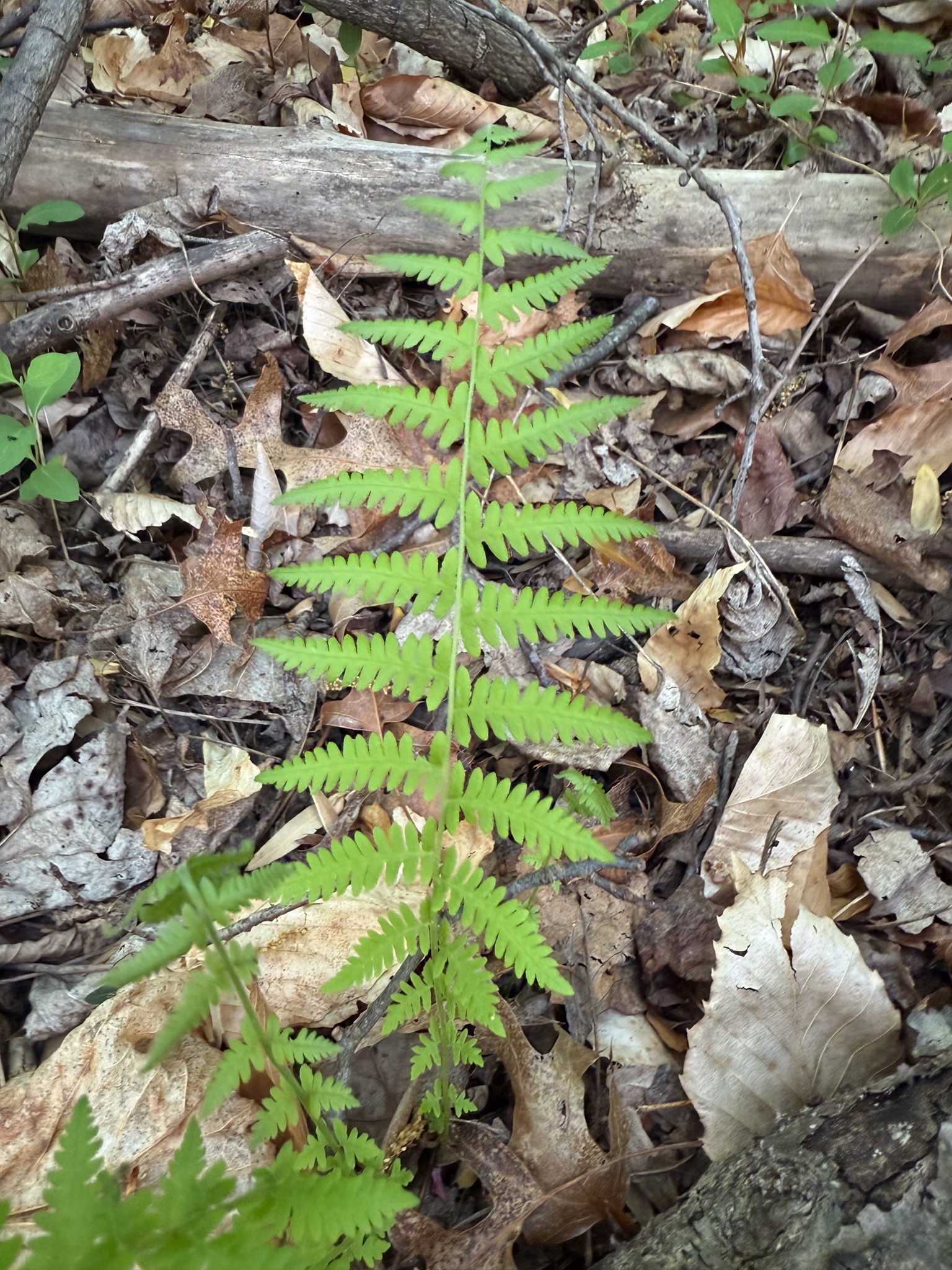 It is distinctive by its pinnae tapering to the base of the frond, and by its forming extensive clonal colonies on ridgetops and mountain benches.[5] The only other native species in this area with similarly tapering pinnae is the ostrich fern, which generally grows in riparian habitats and is much taller (up to 1.5 m or 4.9 ft).[4] The only other species that forms as extensive clonal colonies is the hay-scented fern. Unlike the hay-scented fern, New York fern grows along a dark brown, slightly scaly trailing rhizomes, for comparison, hay-scented fern grows along a smooth rhizome with only one frond arising at a node.[4] Hay-scented fern also has leaflets which are much more finely cut or jagged on the edges whereas New York fern typically has smooth rounded edges to its leaflets.