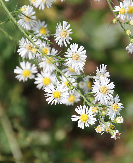 The flower heads of Symphyotrichum pilosum are 13 to 19 mm (0.5 to 0.75 in) wide[8] and grow on branches that are 100 mm (4 in) or less at wide angles off the stem (divaricate). They also may be ascending and arching. They are open, generally not crowded, and have many small leaves. Each flower head is on a peduncle that is usually 5 to 30 mm (0.20 to 1.2 in), sometimes as long as 50 mm (2 in). They get shorter the farther up the branch they grow which then causes the inflorescence to look like a pyramid. The peduncles of S. pilosum var. pilosum have dense and bristly hairs (hispid), and those of S. p. var. pringlei are hairless (glabrous). Both varieties have from 7 to 25 or more bracts that are glabrous and may have cilia.[5]