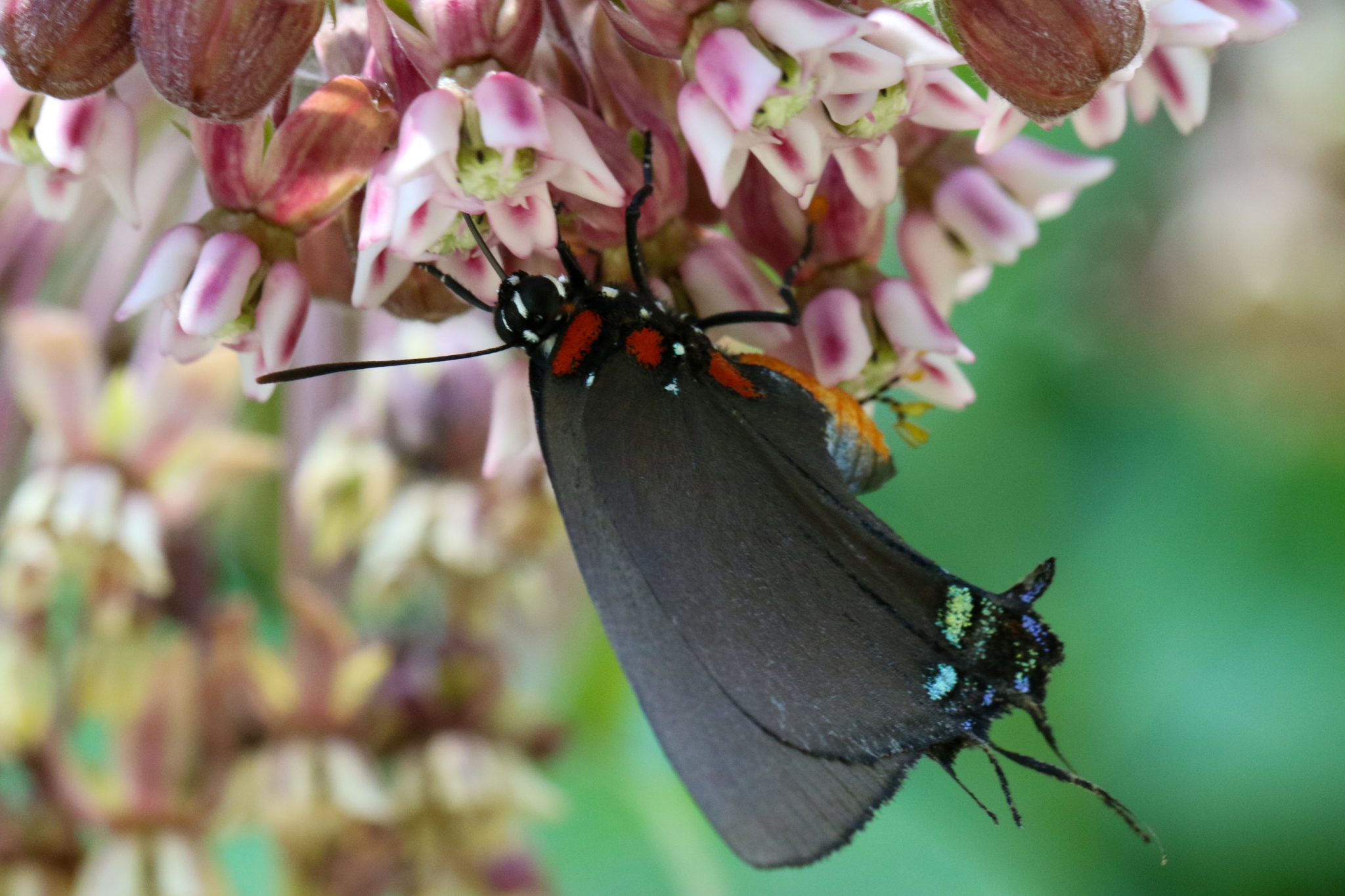 [edit]After about 16 days from pupation to hatching, the adult butterfly will emerge from its chrysalis. Adult butterflies have their orange and black colorings to signal the protective toxins and even have a behavior of rubbing their wings together. This draws attention to the markings on their back wings that serve as a "false head".[6] During flight season, which stretches from spring to early summer, and from early fall to winter, ovipositing females preferentially target isolated mistletoe plants that have trunks of a smaller diameter to lay their eggs on, which is likely to minimize competition from other ovipositing butterflies.[7][10]