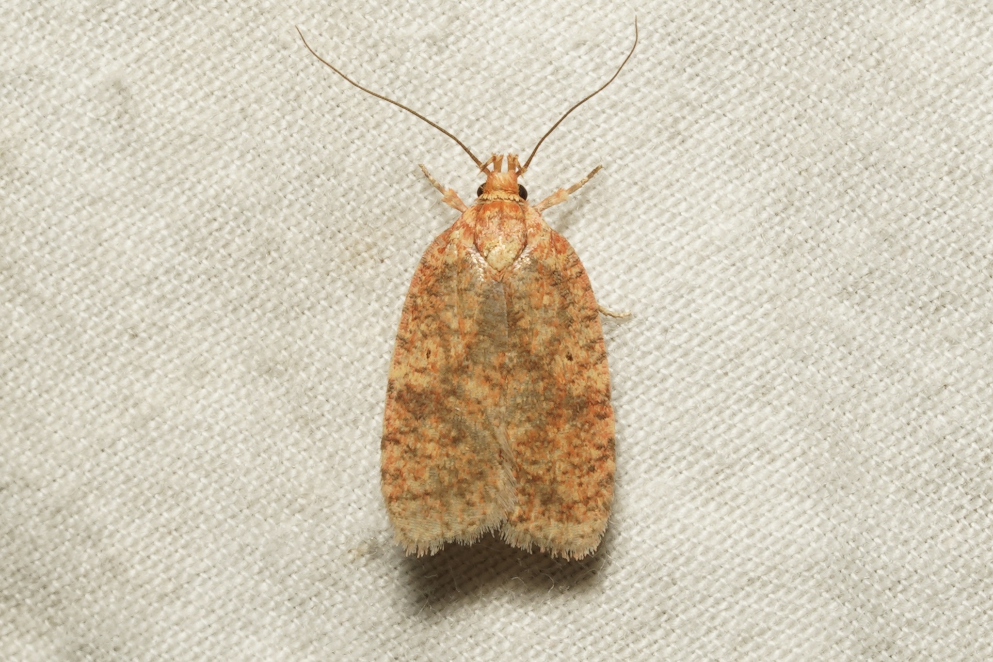 The wingspan is about 16–20 mm. The forewings are yellow, mottled and overlaid with brick red and irrorated (speckled) and shaded with fuscous and black. There are two black discal spots at the basal third and a poorly defined dark band before the termen. There is also a series of indistinct blackish spots along the costa and around the termen. The hindwings are greyish fuscous with a narrowly blackish fuscous terminal edge.[2] Adults are on wing from June to October.