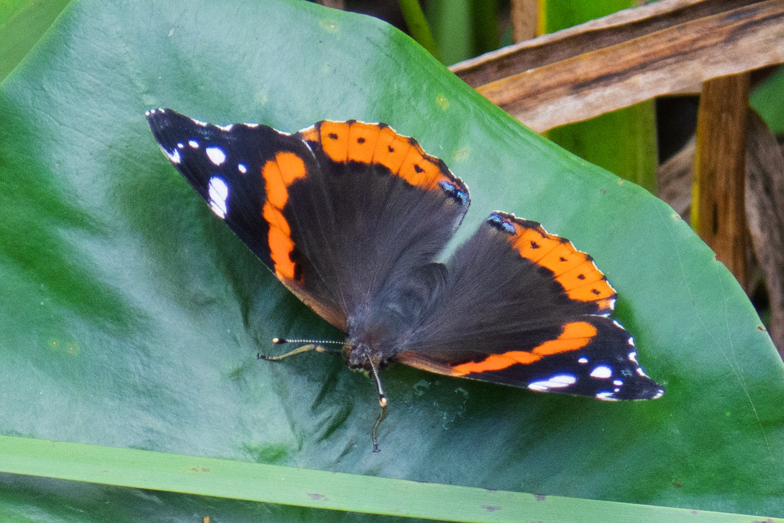 Vanessa atalanta, the red admiral or, previously, the red admirable,[4] is a well-characterized, medium-sized butterfly with black wings, red bands, and white spots. It has a wingspan of about 2 inches (5 cm).[5] It was first described by Carl Linnaeus in his 1758 10th edition of Systema Naturae. The red admiral is widely distributed across temperate regions of North Africa, North America, Europe, Asia, and the Caribbean.[6] It resides in warmer areas, but migrates north in spring and sometimes again in autumn. Typically found in moist woodlands, the red admiral caterpillar's primary host plant is the stinging nettle (Urtica dioica); it can also be found on the false nettle (Boehmeria cylindrica).[7] The adult butterfly drinks from flowering plants like Buddleja and overripe fruit. Red admirals are territorial; females will only mate with males that hold territory. Males with superior flight abilities are more likely to successfully court females. It is known as an unusually calm butterfly, often allowing observation at a very close distance before flying away, also landing on and using humans as perches.[citation needed]