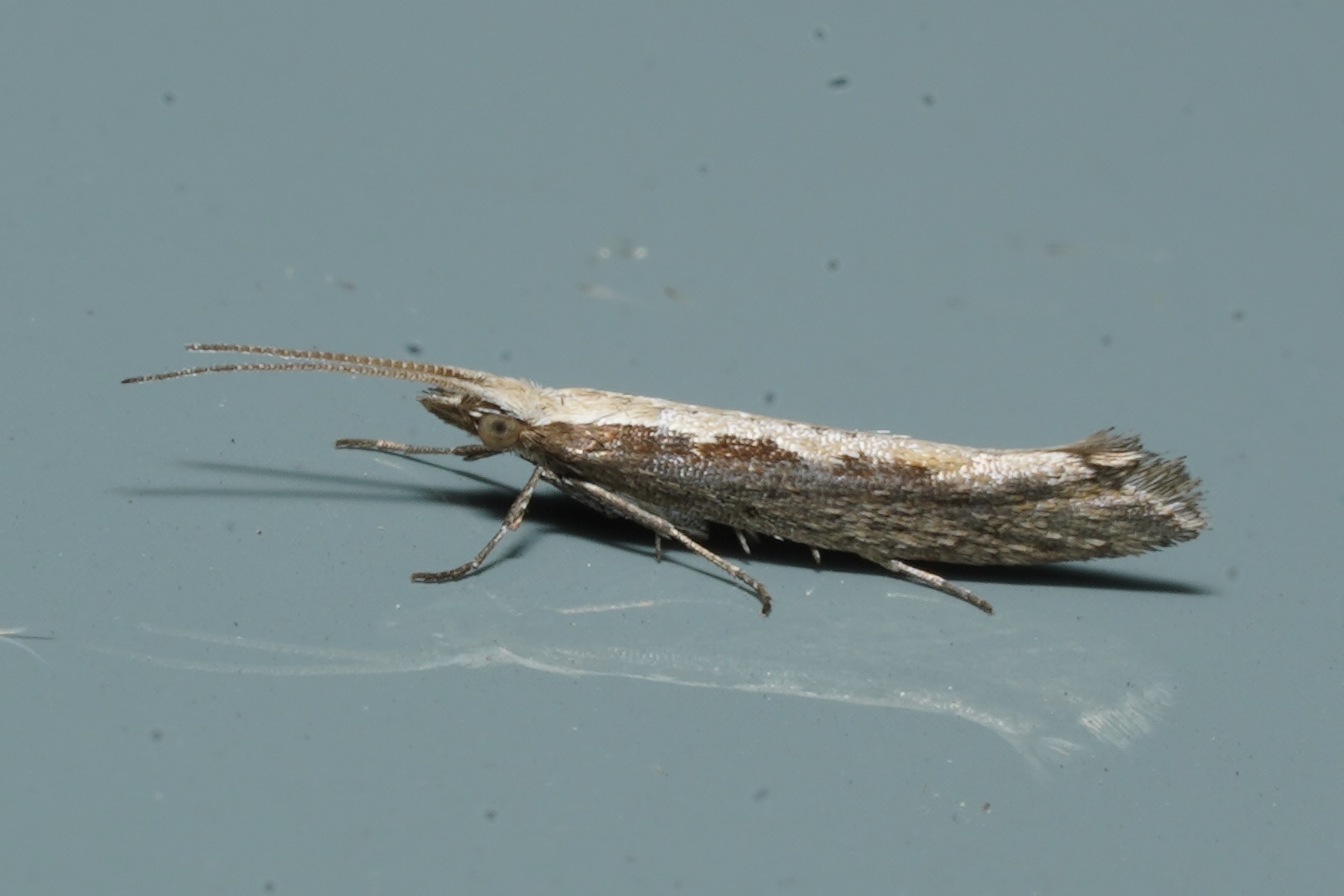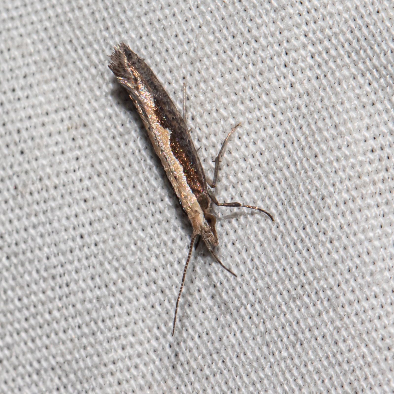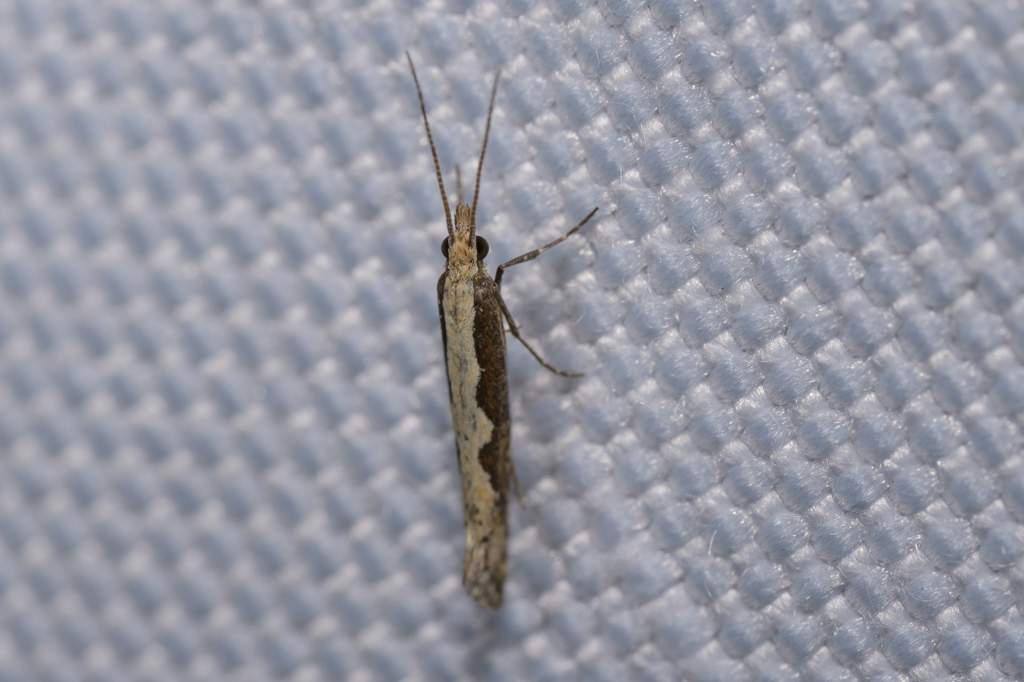 [edit]This small moth is colored gray and brown. It can potentially identified by a cream-colored band that may be present in the shape of a diamond on its back.[1] The diamondback moth has a wingspan of about 15 mm and a body length of 6 mm. The forewings are narrow, brownish gray and lighter along the anterior margin, with fine, dark speckles. A creamy-colored stripe with a wavy edge on the posterior margin[2] is sometimes constricted to form one or more light-colored diamond shapes, which is the basis for the common name of this moth. The hindwings are narrow, pointed toward the apex, and light gray, with a wide fringe. The tips of the wings can be seen to turn upward slightly when viewed from the side. The antennae are pronounced.[1]