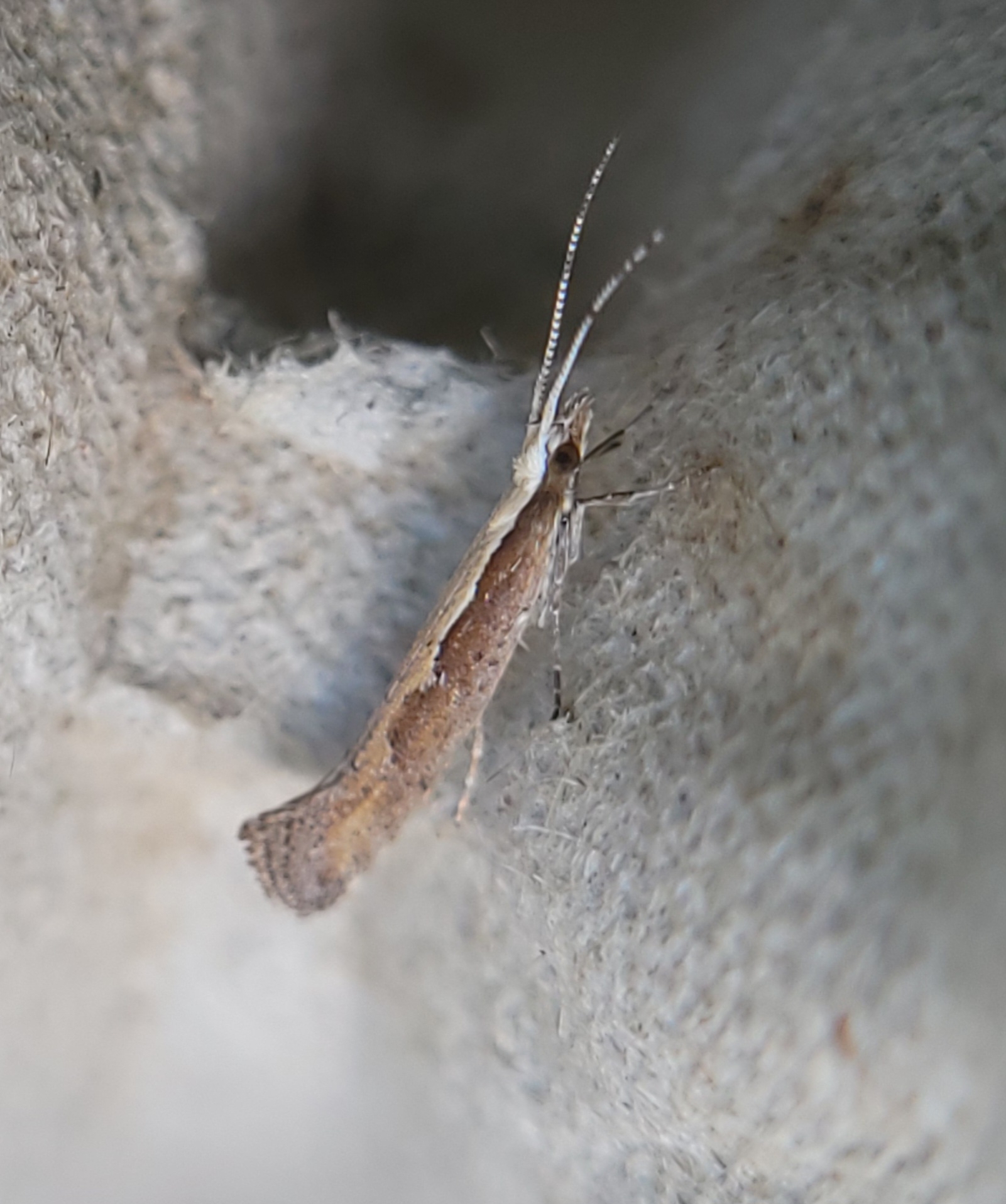 The diamondback moth (Plutella xylostella), sometimes called the cabbage moth, is a moth species of the family Plutellidae and genus Plutella. The small, grayish-brown moth sometimes has a cream-colored band that forms a diamond along its back.[1] The species may have originated in Europe, South Africa, or the Mediterranean region, but it has now spread worldwide.[2][3]
