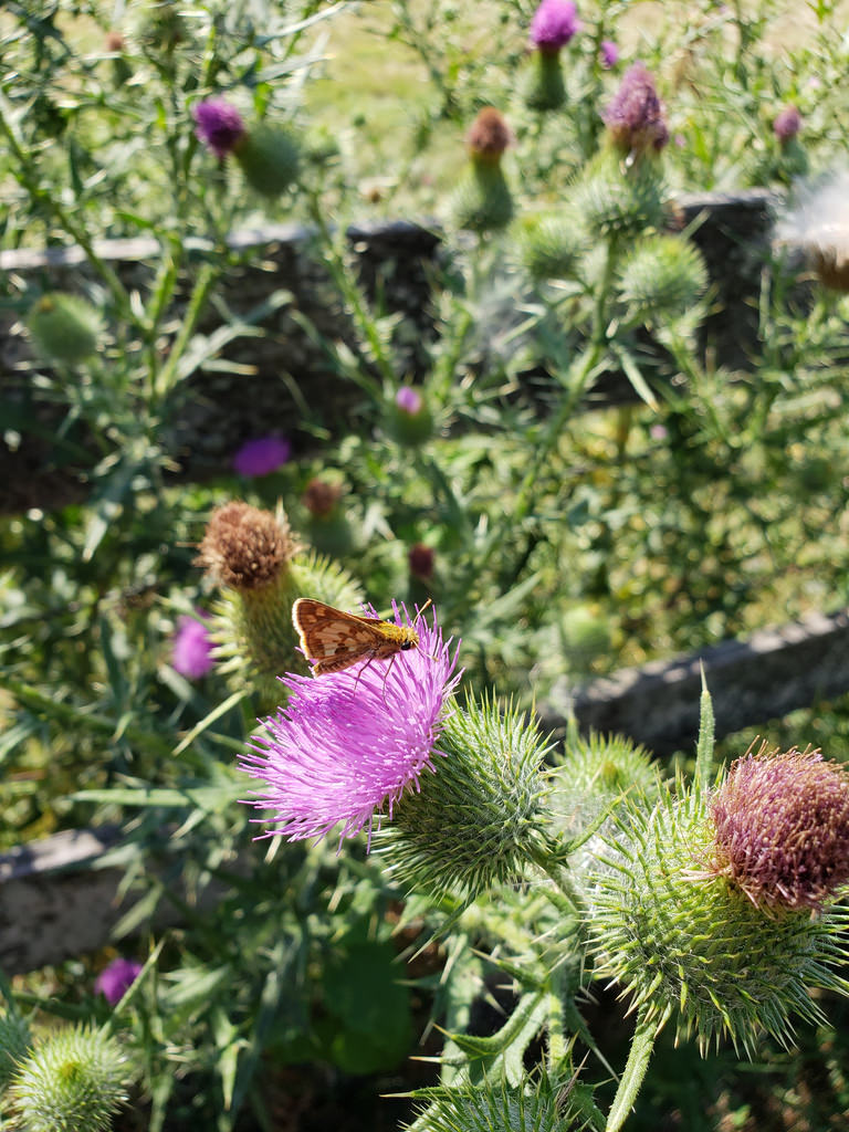 [edit]Peck's skipper flies from May to October, and produces two or three generations each year.[3] Adults consume nectar from flowers including red clover, purple vetch, and thistles. They typically live in grassy habitats including meadows, marshes, and roadsides. Similar to other grass skippers, this species commonly rests with the forewings held open in a V shape, while the hindwings are held out horizontally to the side. They may also have all four folded together so that only the bottom surfaces are visible.[4] Males perch in sunny open areas to await receptive females, and courtship takes place throughout the day.[3] After mating, females lay single eggs. The caterpillars consume rice cutgrass, bluegrass and other grasses.[3]