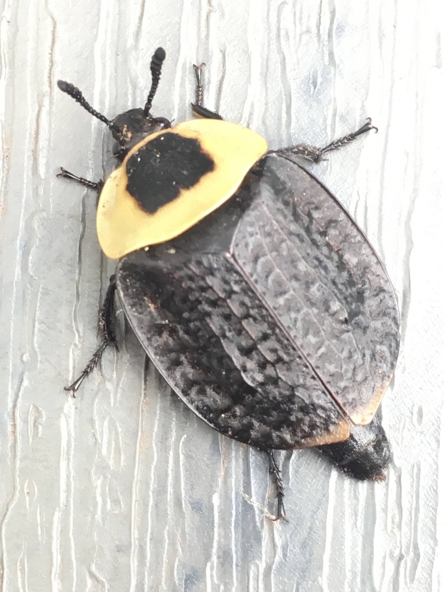 [edit]Necrophila americana are distinctive in that they have a relatively large, broadly rounded, and flattened body with a yellow pronotum. It is the only North American silphid with a mostly yellow pronotum, and it is the only species of Necrophila found in North America, as all other species are found in Asia. There is sexual dimorphism, with the males having rounded elytral apices and females having their apices more prolonged. They typically range from 12 to 22 millimeters long. The larvae can be characterized by their black color, two-segmented urogomphi, and the presence of numerous plates on the sensory area of the second antennal segment. [9]