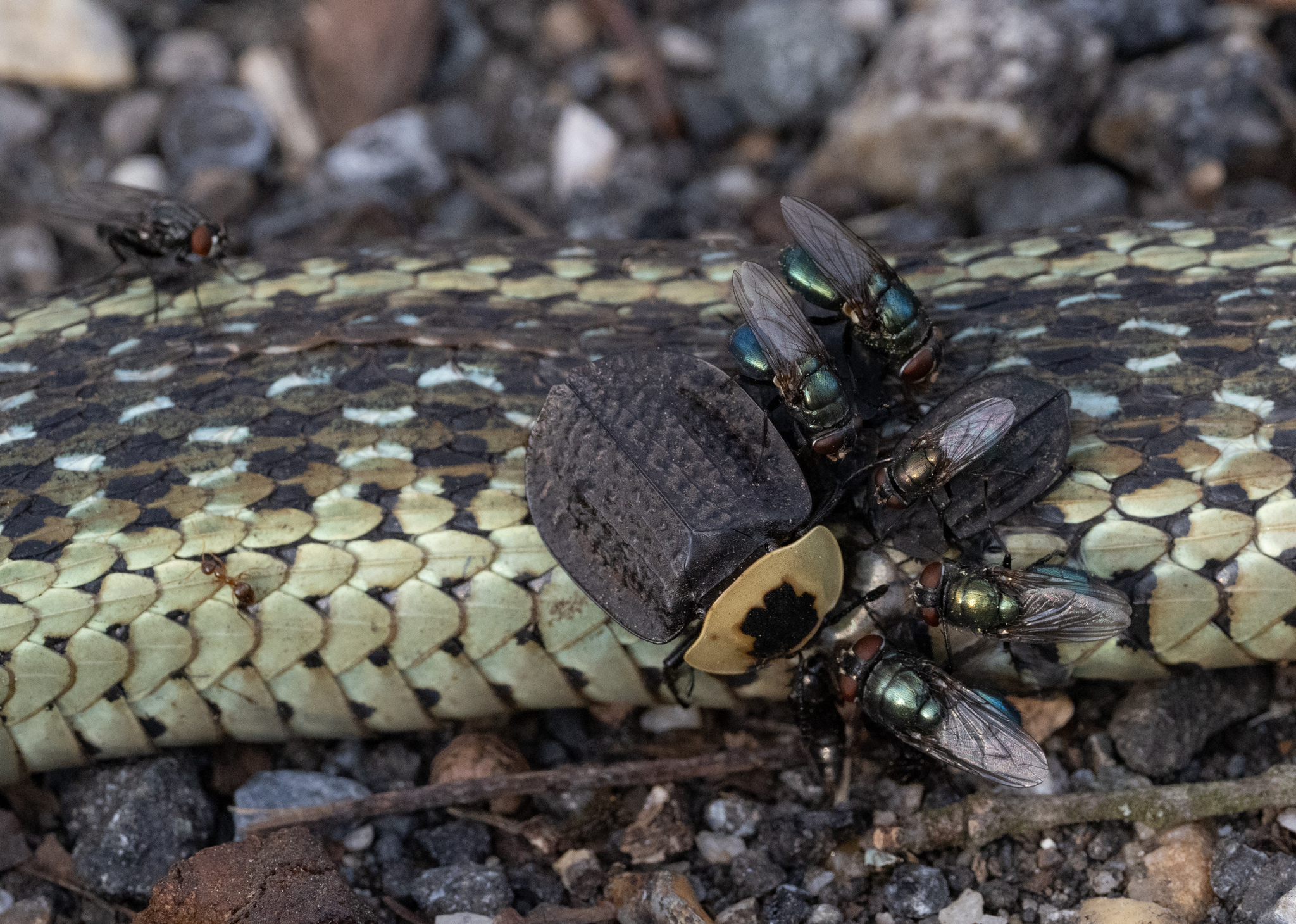 From spring through fall, during daylight, a few hours after flies begin arriving at a carcass, the adult beetles will arrive as well.[3] They immediately begin eating the already hatching fly larvae, mating, and laying their own eggs. As long as the carcass lasts, the adults will remain eating competitors to give their own larvae a chance to eat and grow. Upon hatching from the eggs, the larvae will eat both the carcass and other larvae that are within it. The fly larvae digest part of the carcass, and the beetle larvae will consume the parts that the fly larvae did not, which typically consists of flesh left on the bones and on the moist inside of the face.[5] Eventually the larvae will fall to the ground, dig into the dirt, and pupate. Adults practice overwintering.[2][3]