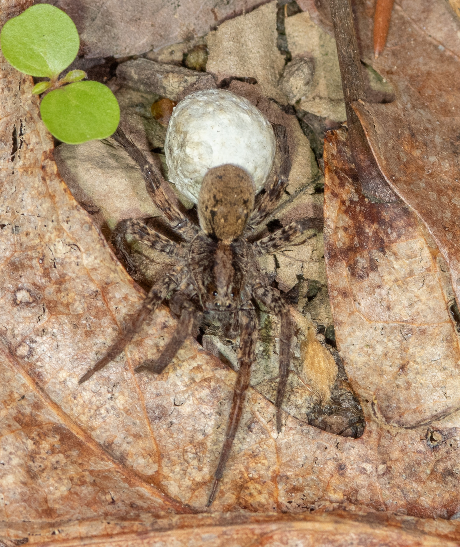 [edit]This spider is nocturnal and hides during the day.[4] It makes no web or shelter of any kind and hides under leaves in the day.[4] The female carries its eggs in a spherical sac until they hatch, after which the spiderlings may ride on the female until able to fend for themselves.[4]
