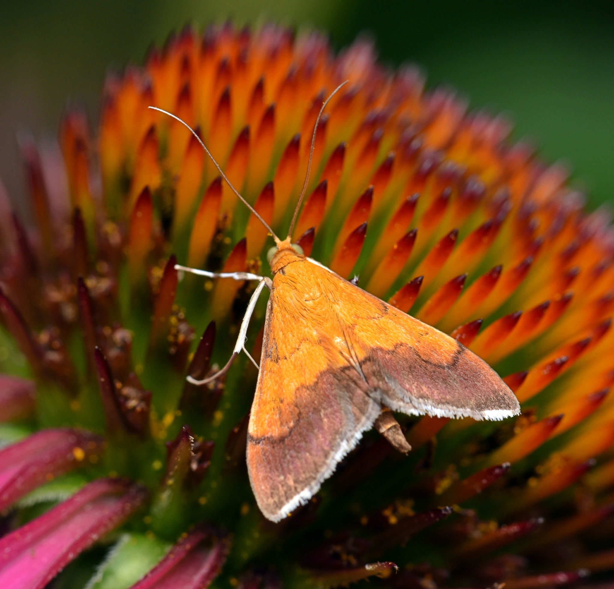 A Bicolored Pyrausta Moth in Howard Co., Maryland (7/24/2017). Verified by A. Hendrickson/BugGuide.