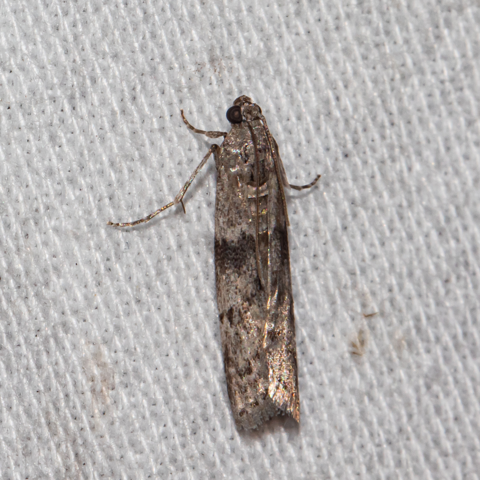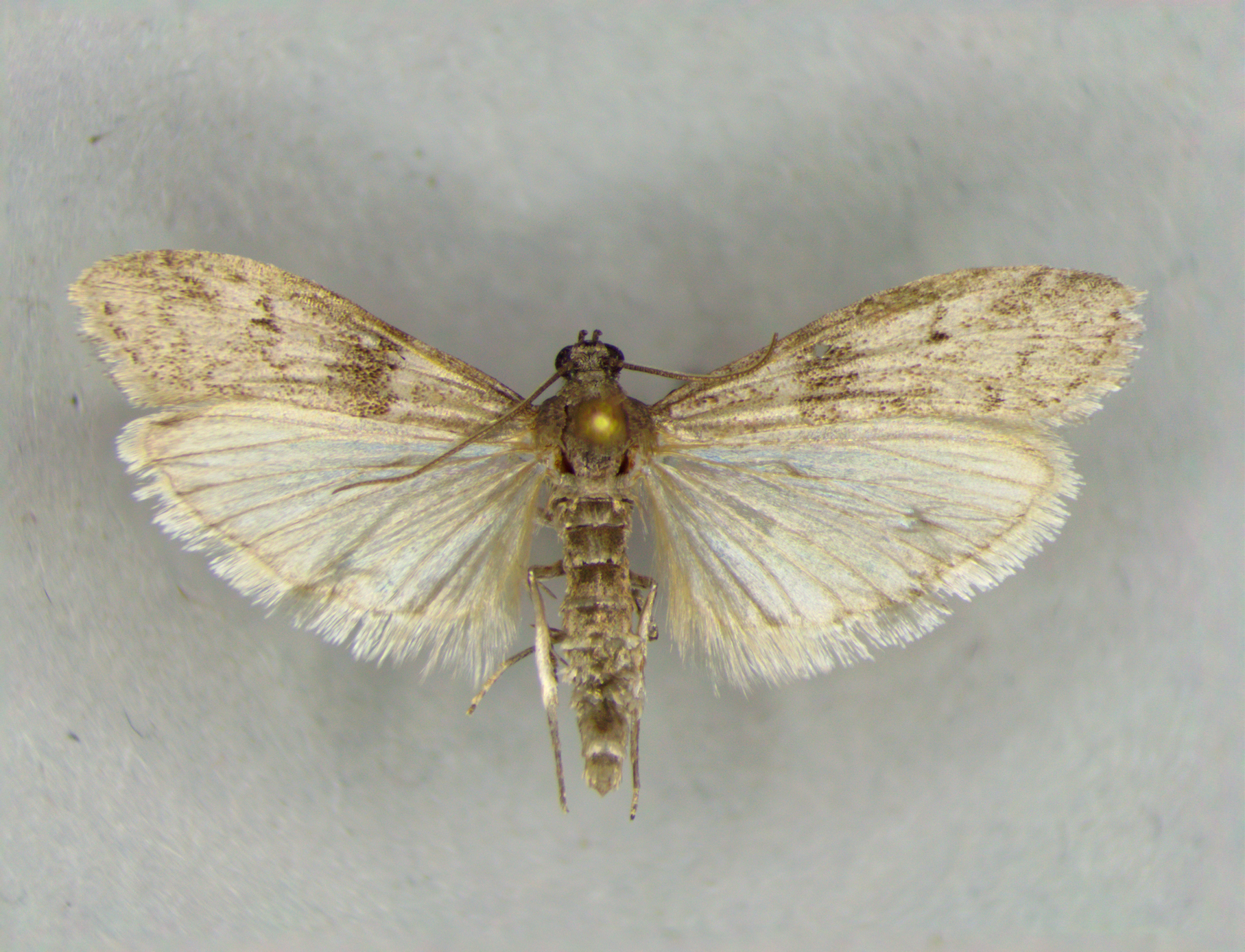 [edit]Adult Mediterranean flour moths have pale gray bodies. Their forewings are gray with black zigzag markings while the hindwings are an off-white color.[4] The wingspan is 1.5-2.6 cm.[2] Larvae (caterpillars) are white or pink with black spots and dark heads. Pupae are reddish brown.[4] Meyrick - Forewings fuscous, irrorated with whitish and sprinkled with dark fuscous; lines hardly paler, first posteriorly dark-edged, nearly straight, rather oblique, serrate-indented above middle and near dorsum, second strongly indented near costa, dark-edged, with darker dots on veins; two blackish transversely placed discal dots. Hindwings whitish, veins and termen fuscous, in male without whitish ochreous hair-tufts.[5][6][7][8]