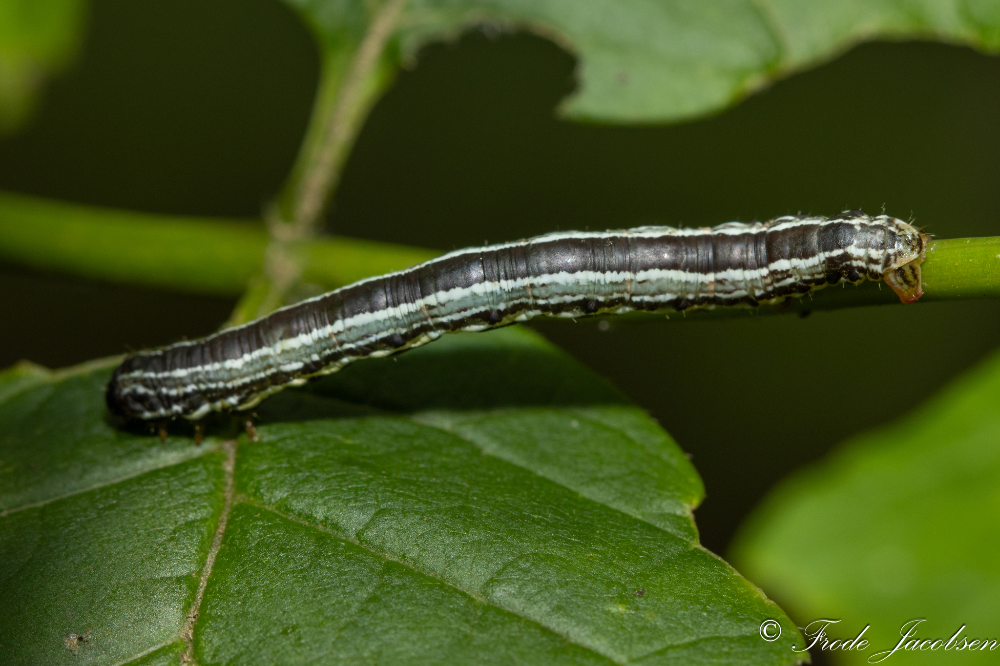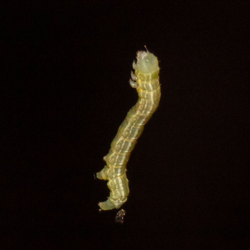 [edit]The caterpillars grow to about 25 mm long. In color, they vary from light green to a dark brownish green. Light green caterpillars have white lines running down the body from the head to the tip of the abdomen while the darker caterpillars have a black stripe the length of their back. Larvae have three pairs of legs on their thorax and three pairs of prolegs on their abdomen. The first pair of prolegs (on segment 8, unexpected in Geometridae as opposed to Noctuidae) is much smaller than the last two pairs (the one on segment 9 typical for geometer moths and the pygopodium at the end of the animal). The pupa is wrapped in a silk cocoon and is buried just beneath the surface of the ground.[1]