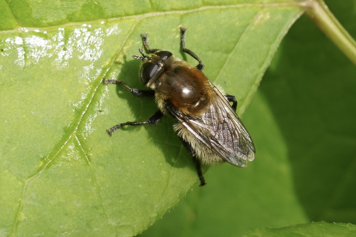 Merodon equestris (Narcissus bulb fly, greater bulb fly, large bulb fly, large Narcissus fly)[2] is a Holarctic species of hoverfly (Family Syrphidae).[3][4][5] [6][7][8] Like many other hoverflies it displays a colouration pattern similar to a stinging insect (a bumblebee in this case) as an evolutionary defense mechanism. Other syrphid bee mimics are Mallota, Arctophila, Criorhina, Pocota and Brachypalpus. Merodon species are distinguished from these by the very strong hind femora, which bear a large triangular projection on the underside near the tip. It flies in low vegetation while the other bumblebee mimics prefer higher vegetation layers.