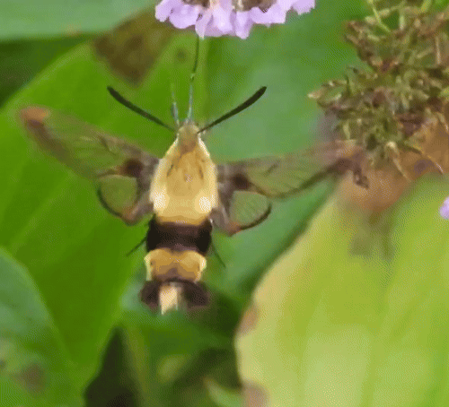 [edit]It flies during the daylight much like the other hummingbird moths, but it may also continue flight into the evening, particularly if it has found a good source of nectar.