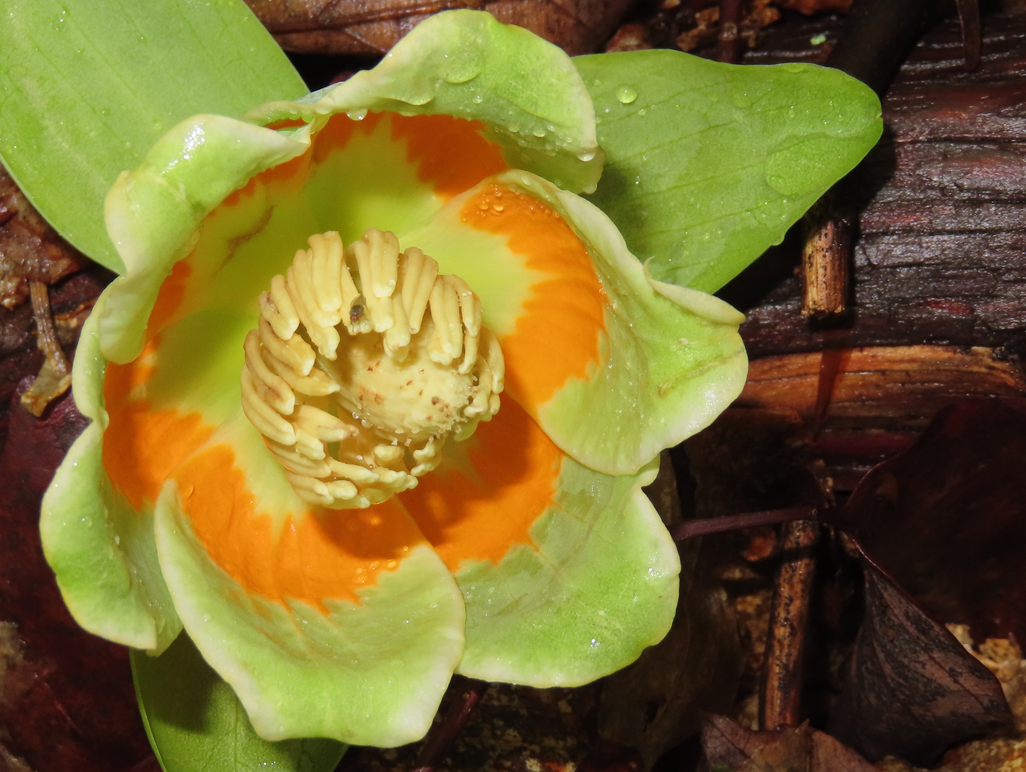 - Corolla: Cup-shaped, petals six, 50 mm (2 in) long, in two rows, imbricate, hypogynous, greenish yellow, marked toward the base with yellow. Somewhat fleshy in texture.