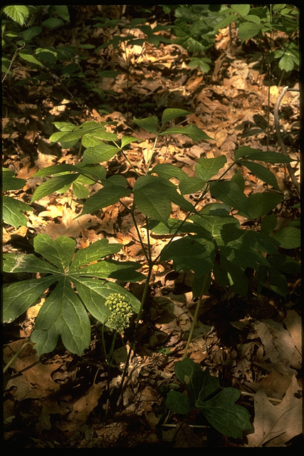The stem of the plant grows straight up from the ground and divides into a whorl of three pinnately compound leaves with 3 to 7 (most often 5) leaflets arranged on either side of a central stalk. The leaflets are ovate, acute, serrate, and green.[4] Technically, all the leaflets on one plant are considered to be one entire leaf, and the stems that connect the leaflets are called rachis; this arrangement is called doubly compound. In some cases some of the leaflets are further completely subdivided, forming a triply compound pattern.